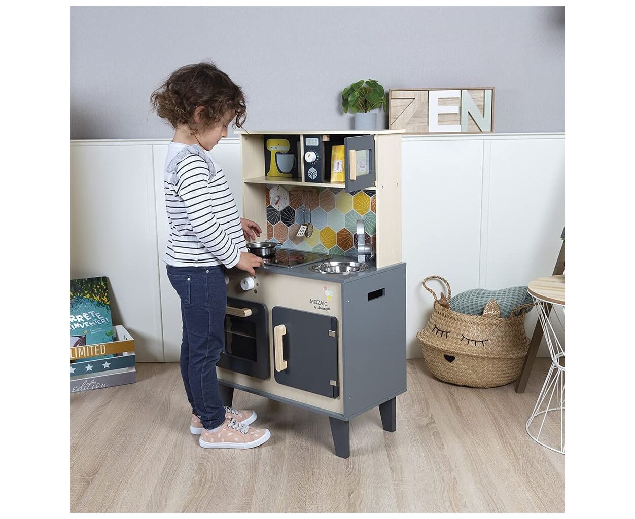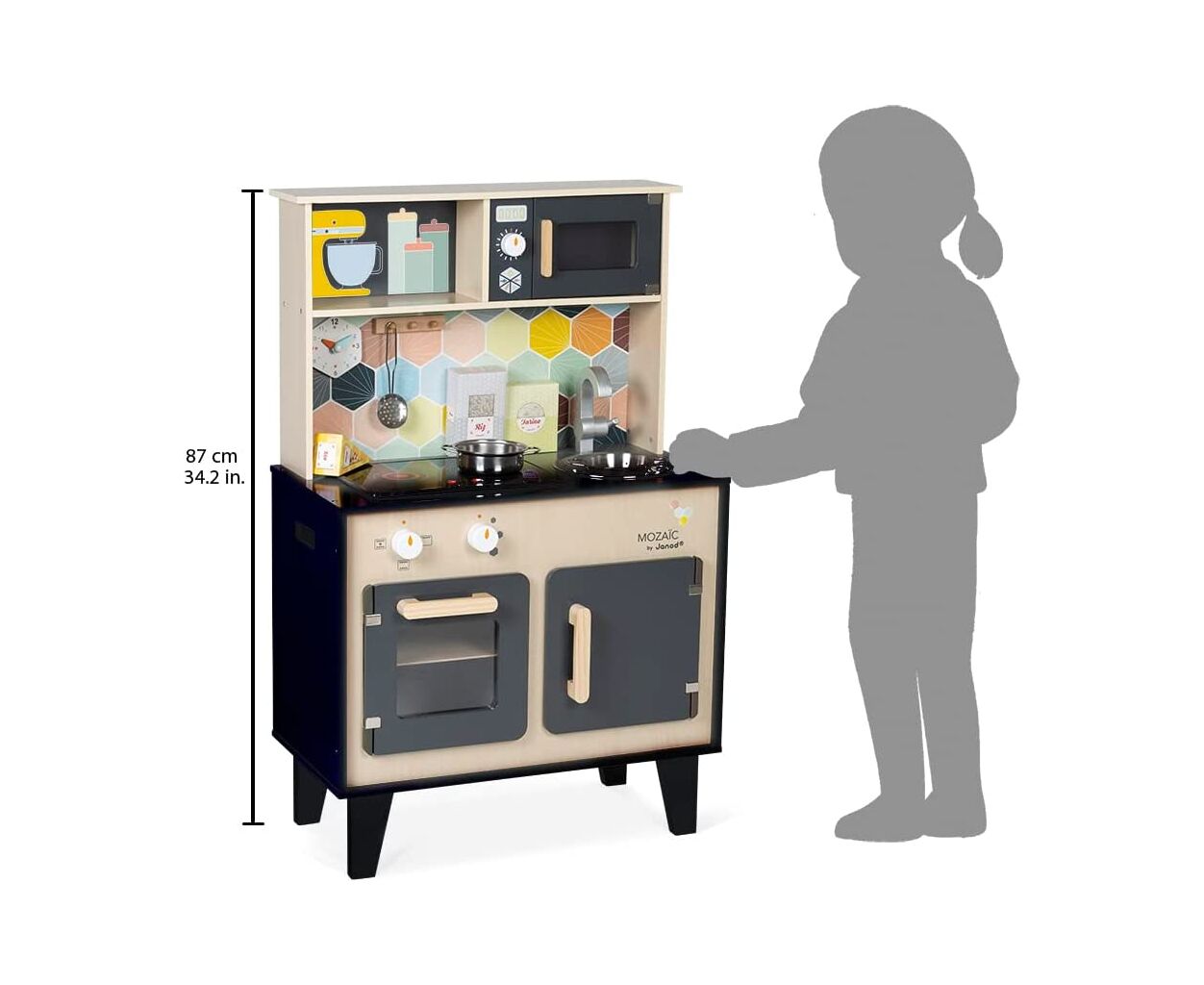 Janod Mozaіс - детский кухонный гарнитур с настоящим характером. Красивое сочетание натурального дерева, черной краски и цветной мозаики придает игрушке действительно стильный вид. Дети, творящие на такой кухне, обязательно придумают несколько новаторских рецептов. Так что дайте волю их воображению и посмотрите, как далеко может унести их вдохновение от мамы и папы.