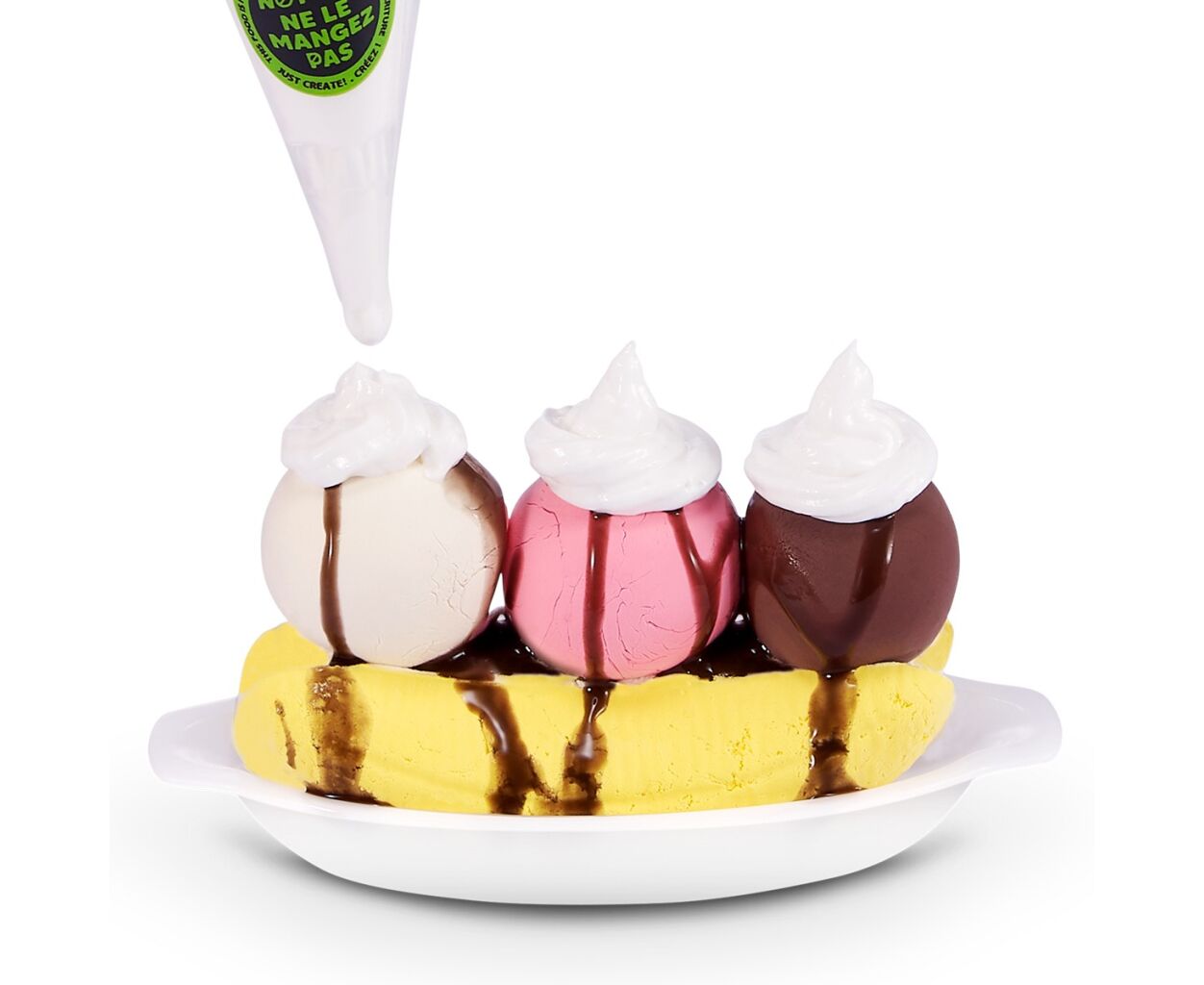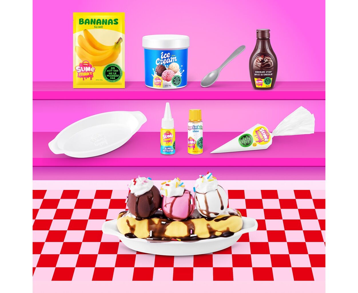 • слайм-мороженое, слайм-сироп шоколадный, слайм-сливки, слайм-банан, посыпка, 2 игрушечных кондитерских изделия