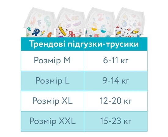 Тип - одноразовий, Вид - трусики, кількість в упаковці - 24 шт, вагова група - від 15 до 23 кг, розмірна сітка - 7, різнокольоровий