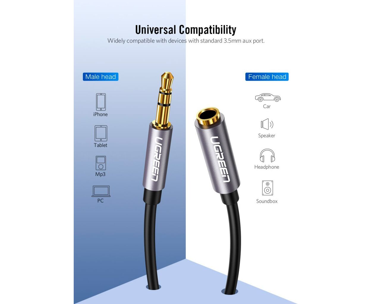 Описание Кабель мультимедийный 3.5mm M to 3.5mm F 2.0m AV118 gray Ugreen (10594)