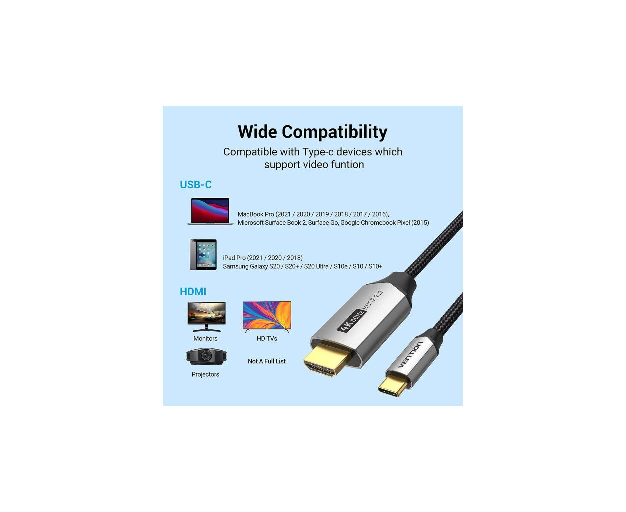 Описание Кабель мультимедийный USB-C to HDMI M 2.0m V2.0 4K 60Hz black VENTION (CRBBH)