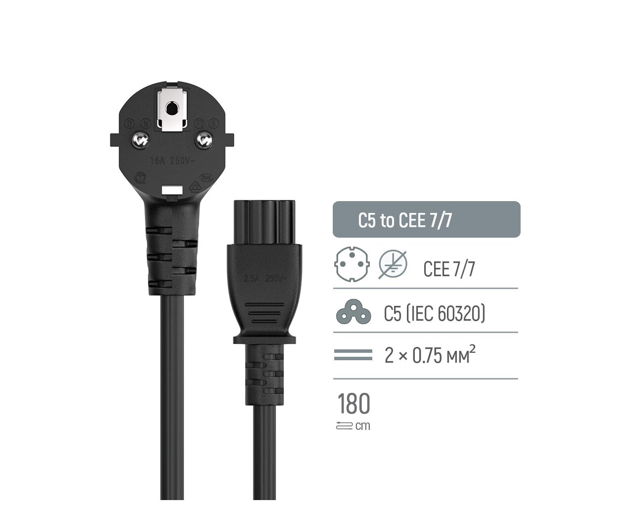 - Входной интерфейс: CEE 7/7 (европейская вилка), 220 ВИсходный интерфейс: C5 (IEC 60320 C5, «Микки Маус»)Сечение проводника: 3 × 0.5 мм²Материал оболочки: ПВХЦвет: чер.