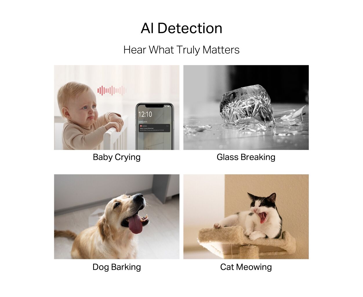 Услышьте то, что действительно важноС помощью анализа на основе искусственного интеллекта система распознает плач ребенка, звон разбитого стекла и звуки, издаваемые домашними животными, обеспечивая своевременное оповещение о звуках, требующих вашей реакции.