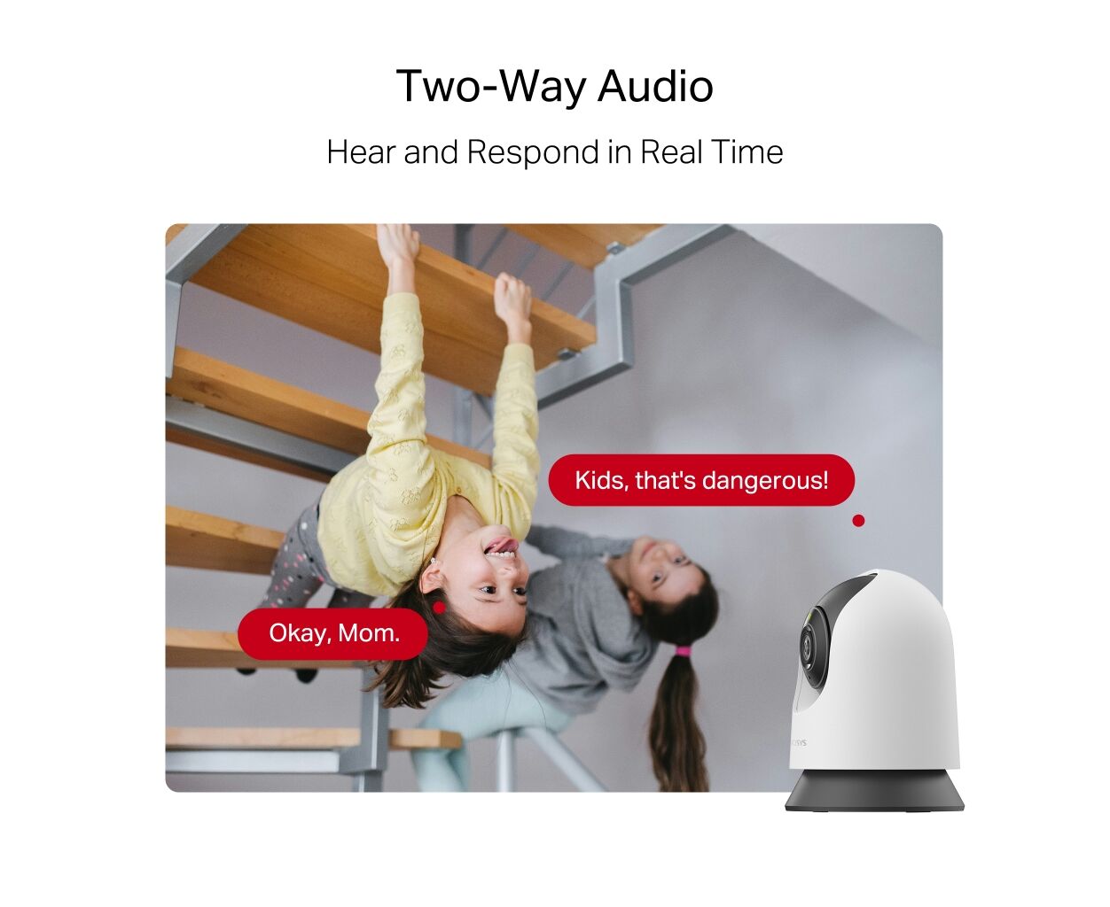 Двусторонняя аудиосвязьСлушайте и отвечайте в режиме реального времени с помощью встроенного микрофона и динамика. Общайтесь со своей семьей и домашними животными в любое время.