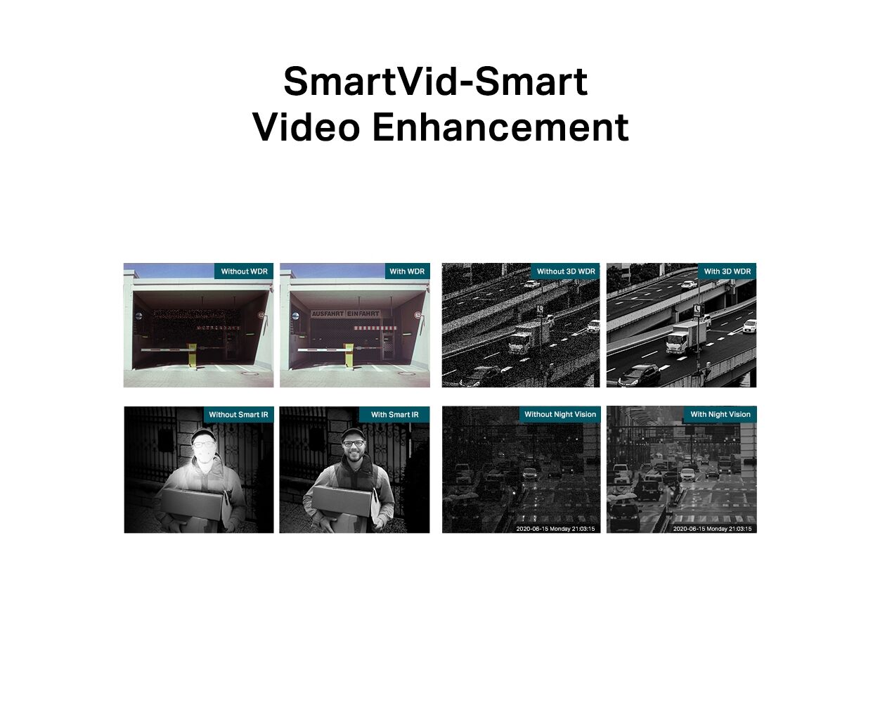 Для улучшения качества изображения камера предлагает технологии BLC, DWDR и HLC, которые автоматически корректируют яркость и контрастность, обеспечивая оптимальное освещение даже в сложных условиях освещения. Благодаря функциям Smart IR, WDR, 3D DNR обеспечивается высокое качество видео даже при плохом освещении.
