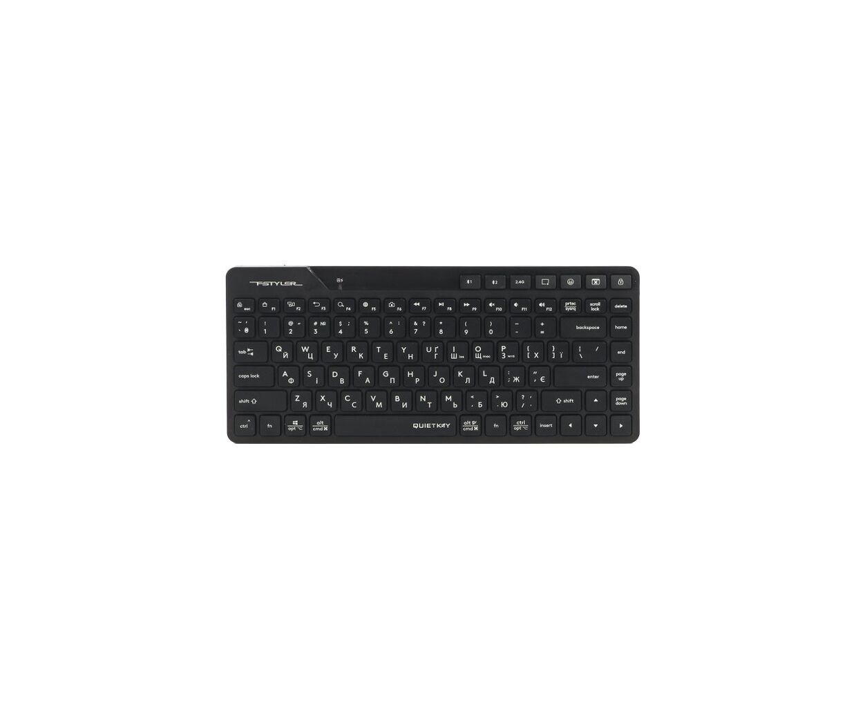мультимедийная, мембранная, беспроводная, USB адаптер 2.4 ГГц, Bluetooth, компактная, английская, украинская, бесшумный ввод, 138 х 315 х 27 мм