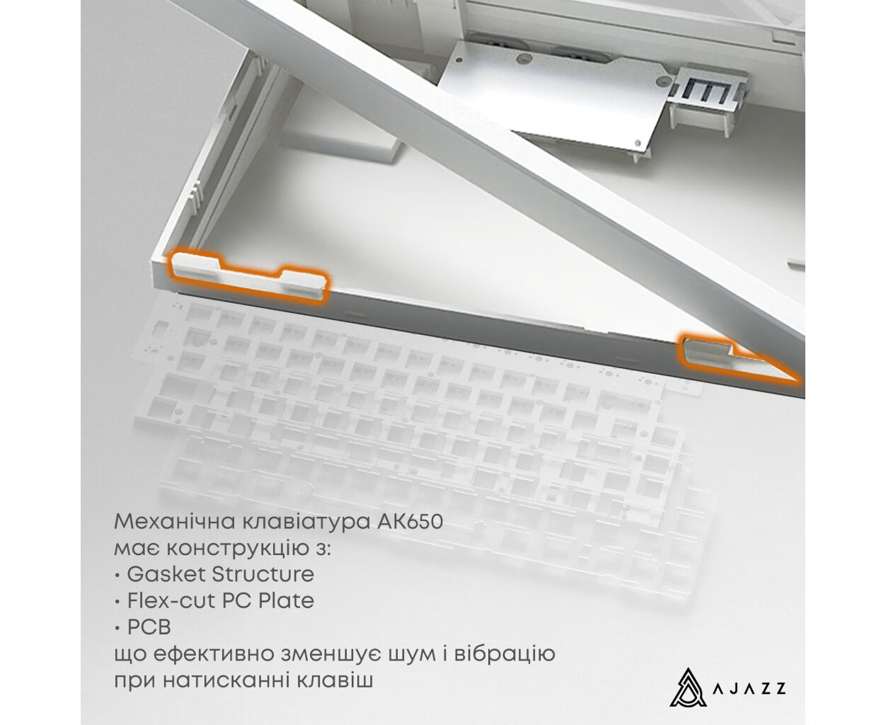 Конструкция клавиатуры подчёркивает эргономику и стабильность. С весом в 570 грамм, Ajazz AK650 не только легко транспортировать, но и стабильно использовать во время интенсивных игровых сессий или при наборе текста. Проверенная Gasket-монтажная технология уменьшает шумы и вибрации, повышая комфорт во время длительных сессий.