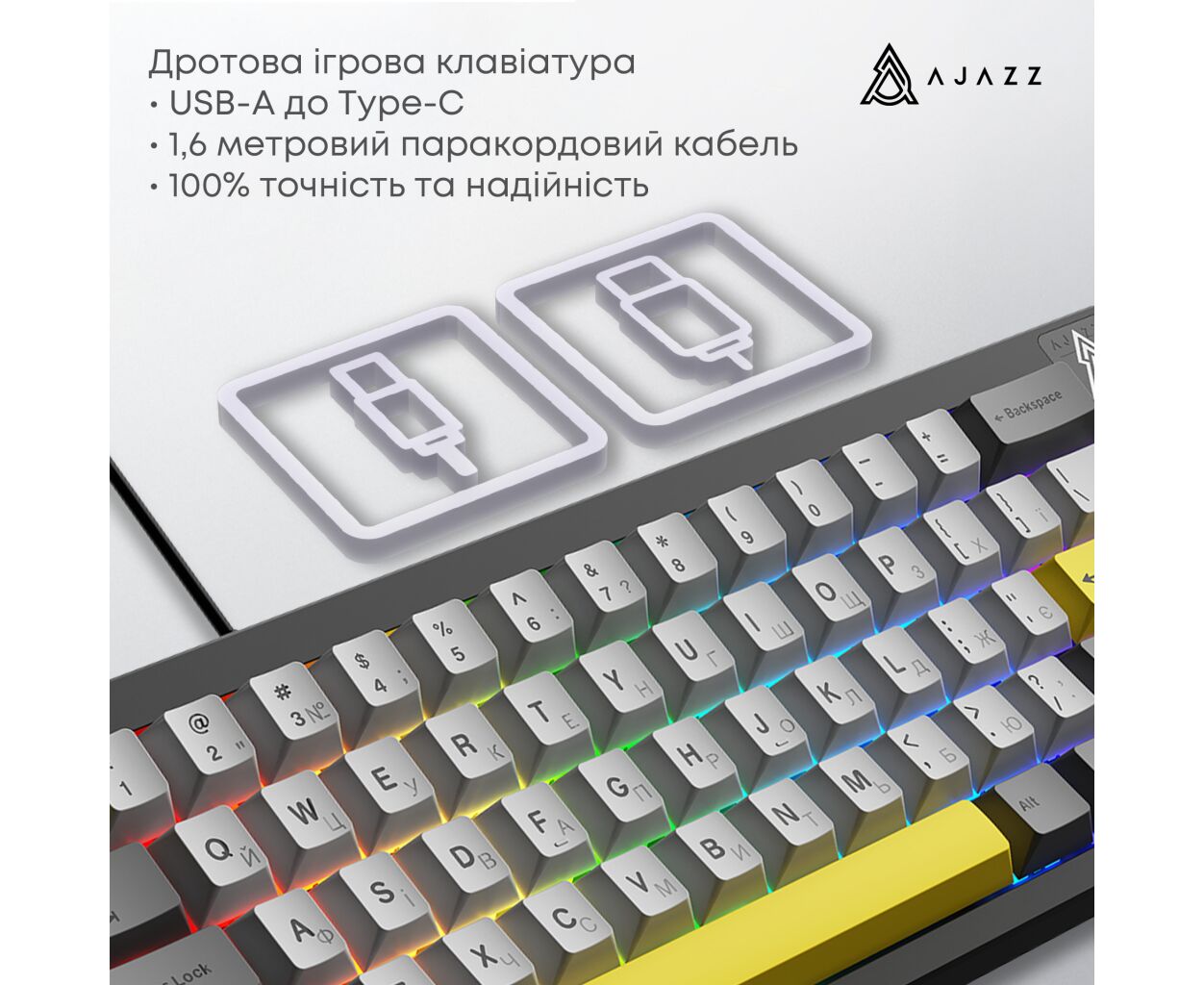 Особенностью Ajazz AK650 является RGB-подсветка, которая придаёт устройству не только выразительный вид, но и позволяет создавать атмосферу для лучшего погружения в игру или рабочие процессы даже в темное время суток. Благодаря английской и украинской раскладке клавиатура подходит для разнообразных задач, от программирования до текстовой работы.