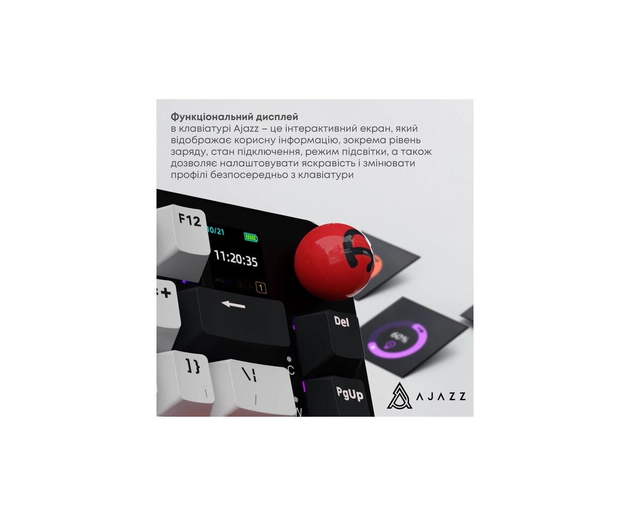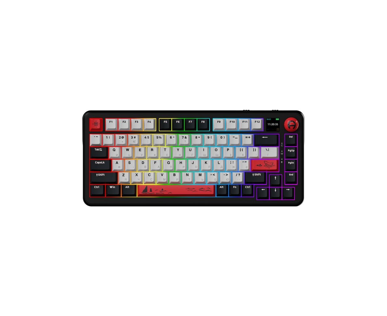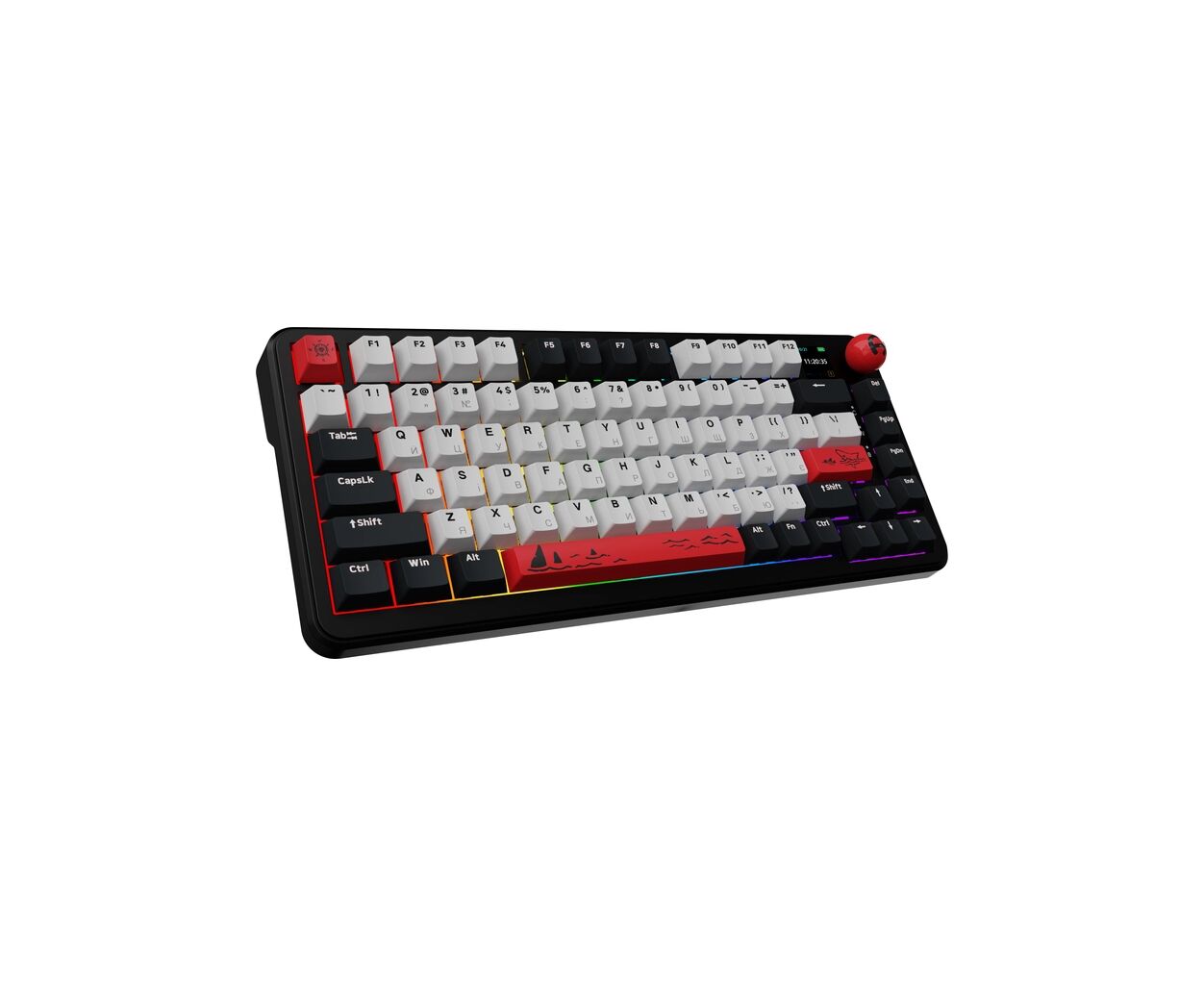 Особое внимание привлекает TFT Color Smart Display, который позволяет без лишнего софта настраивать параметры клавиатуры. Он отображает время, статус подключения, GIF-анимации и дает возможность легко управлять RGB-подсветкой клавиатуры, что добавляет вашему рабочему пространству стиля и настроения. Возможность интуитивно изменять громкость и языковой интерфейс обеспечивает удобство без необходимости переключения окон на экране.