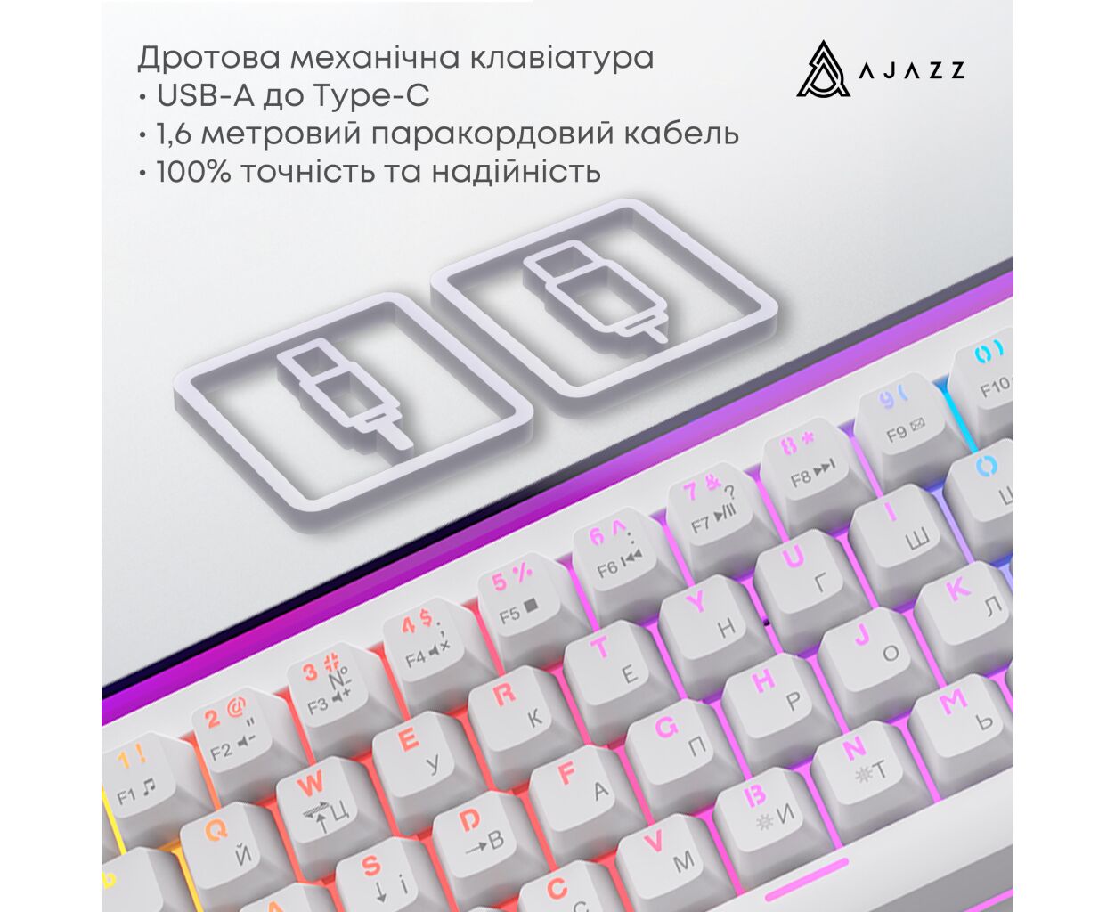 игровая, мультимедийная, с подсветкой, механическая, проводная, USB, полноразмерная, Подсветка - Rainbow LED, английская, украинская, Переключатели (Switches) - Ajazz Red Switch, Клавиш - 68, сменные клавиши, для программиста, Шнур - 1.6 м, 327x114x34 мм, 510 г