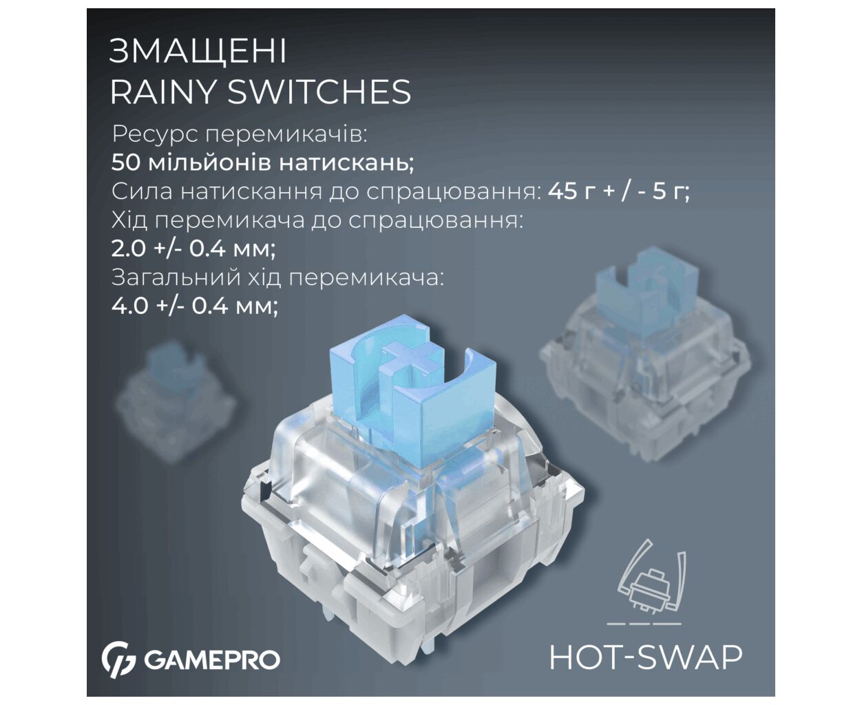 Модель оснащена механическими переключателями Rainy, предварительно смазанными на заводе с поддержкой Hot-Swap, что позволяет легко заменять переключатели. Благодаря этому клавиатура обеспечивает плавный ход и комфортное нажатие как в игре, так и при наборе текста.