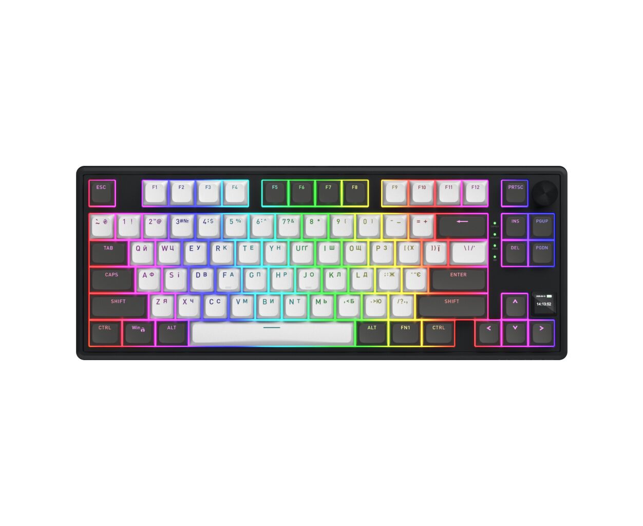 Skyfall 80 Pro поддерживает три режима подключения: проводной, через USB адаптер на 2.4 ГГц, или Bluetooth, позволяя работать с Windows, Chrome OS, Mac OS и Linux. Интегрированный TFT экран предоставляет удобный доступ к важной информации или позволяет показать любимую анимацию.