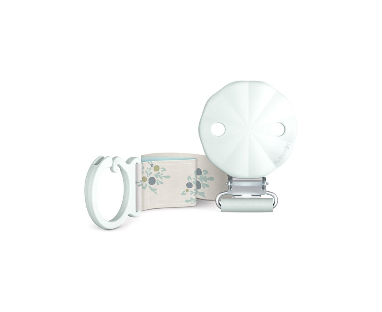 Описание Клипса для пустышек Suavinex Poetry із тканинною стрічкою, м'ятна з малюнком (402998)