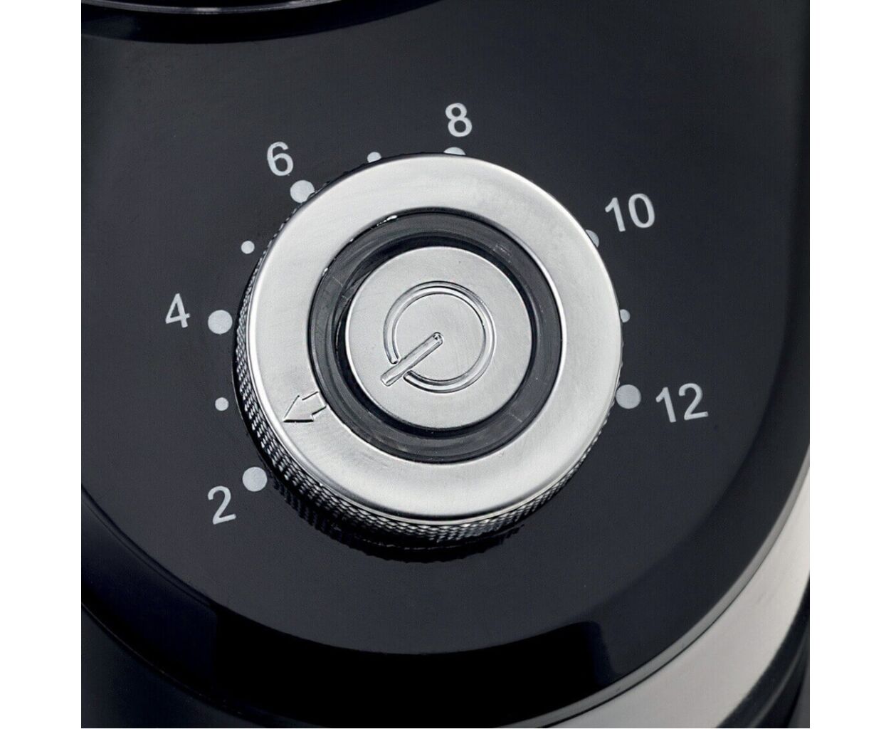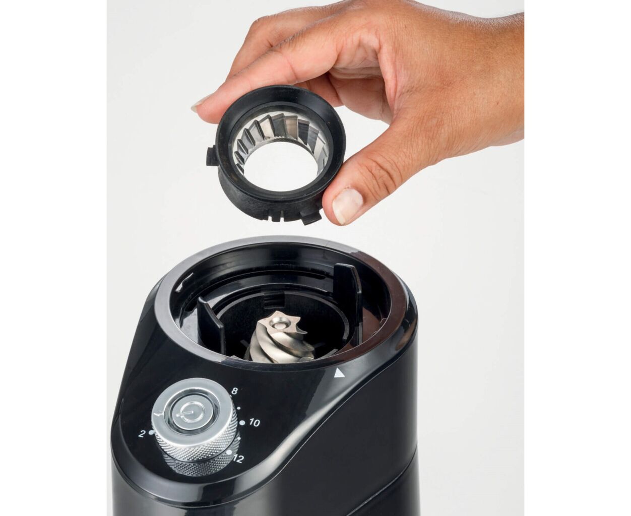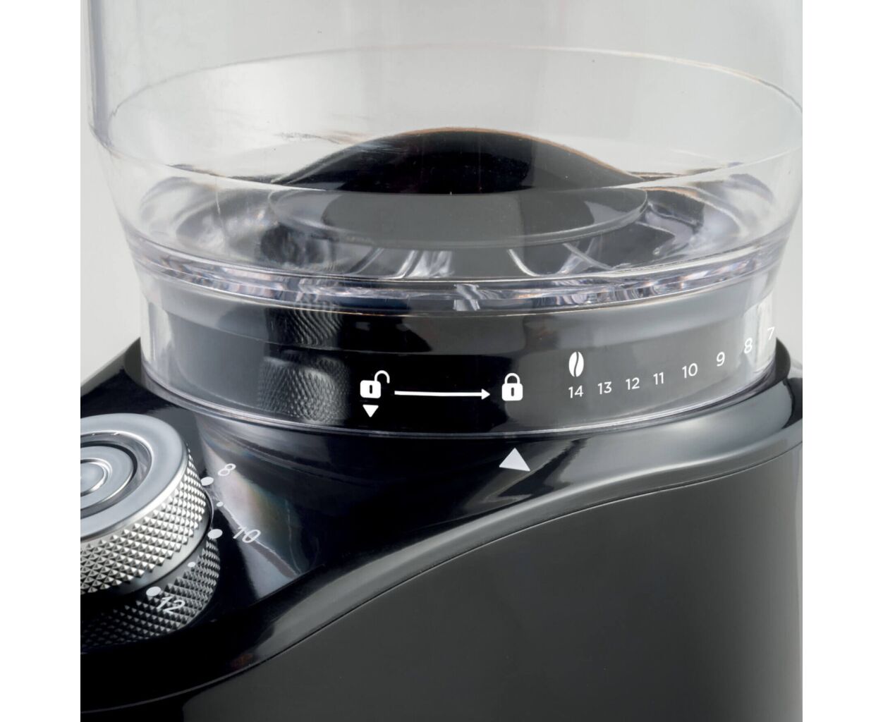 Основным преимуществом является гибкость настроек: пользователь может выбрать одну из 14 степеней помола – от очень мелкого для эспрессо до грубого для заваривания во френч-прессе. Кроме того, есть возможность регулировать количество перемалываемого кофе от 2 до 12 чашек, в зависимости от потребностей. Корпус кофемолки выполнен из крепкого пластика черного цвета. Прибор оснащен системой безопасности, блокирующей работу, если контейнеры установлены неправильно, а также нескользящими ножками для устойчивости. В комплекте предусмотрена специальная щеточка для легкой очистки съемных жерновов и других частей.