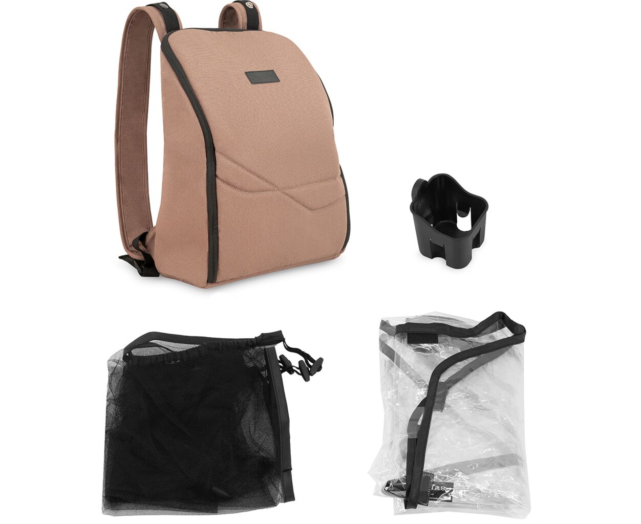 Коляска MoMi ANDREA оснащена аксессуарами, которые сделают каждую прогулку более приятной и комфортной. В комплект входят рюкзак для хранения необходимых вещей, подстаканник, москитная сетка и дождевик. Рюкзак также легко крепится на ручку коляски.