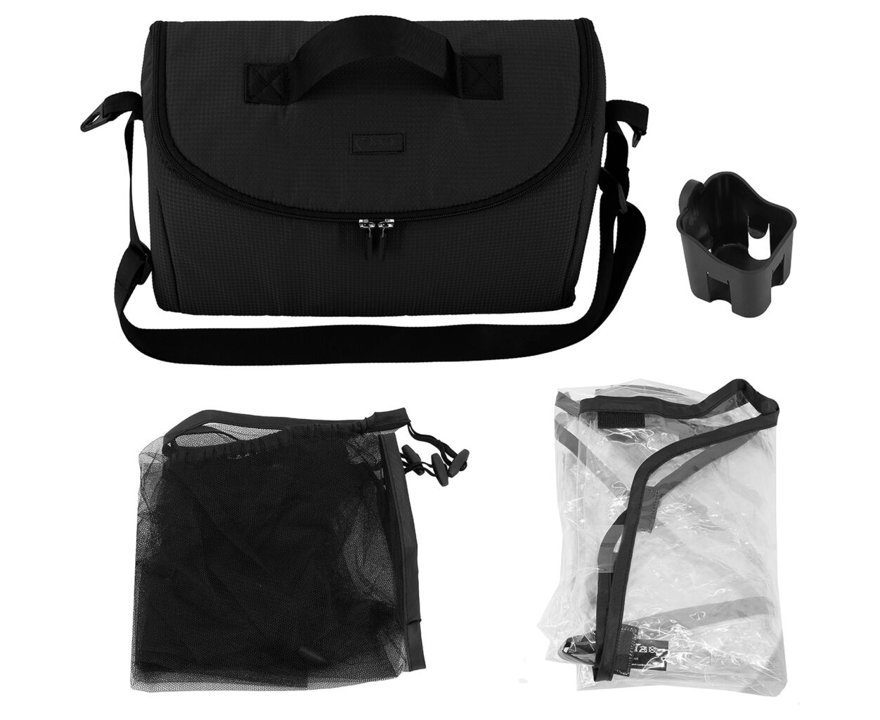 • прогулочный блок, сумка, чехол для ног, дождевик, подстаканник, москитная сетка, ручка безопасности на запястье