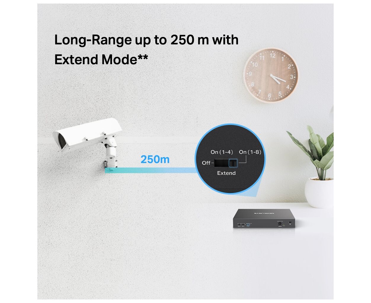 Режим увеличения дальности позволит увеличить расстояние работы PoE до 250 метров. Данный режим поддерживается каждым из восьми портов MS110P с поддержкой PoE+. Режим увеличения дальности идеально подойдёт для развёртывания системы видеонаблюдения на большой площади.