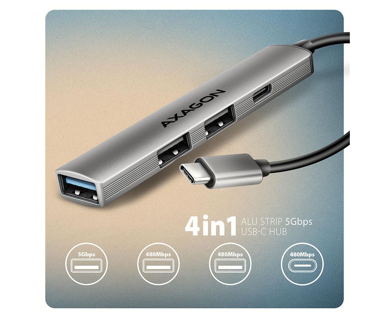 Концентратор AXAGON USB-C to 1xUSB-A 5Gbps + 2xUSB-A 480Mbps + 1xUSB-C 480Mbps 0.12m aluminum (HUE-STC)