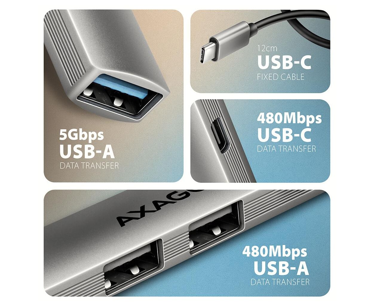Характеристики Концентратор AXAGON USB-C to 1xUSB-A 5Gbps + 2xUSB-A 480Mbps + 1xUSB-C 480Mbps 0.12m aluminum (HUE-STC)