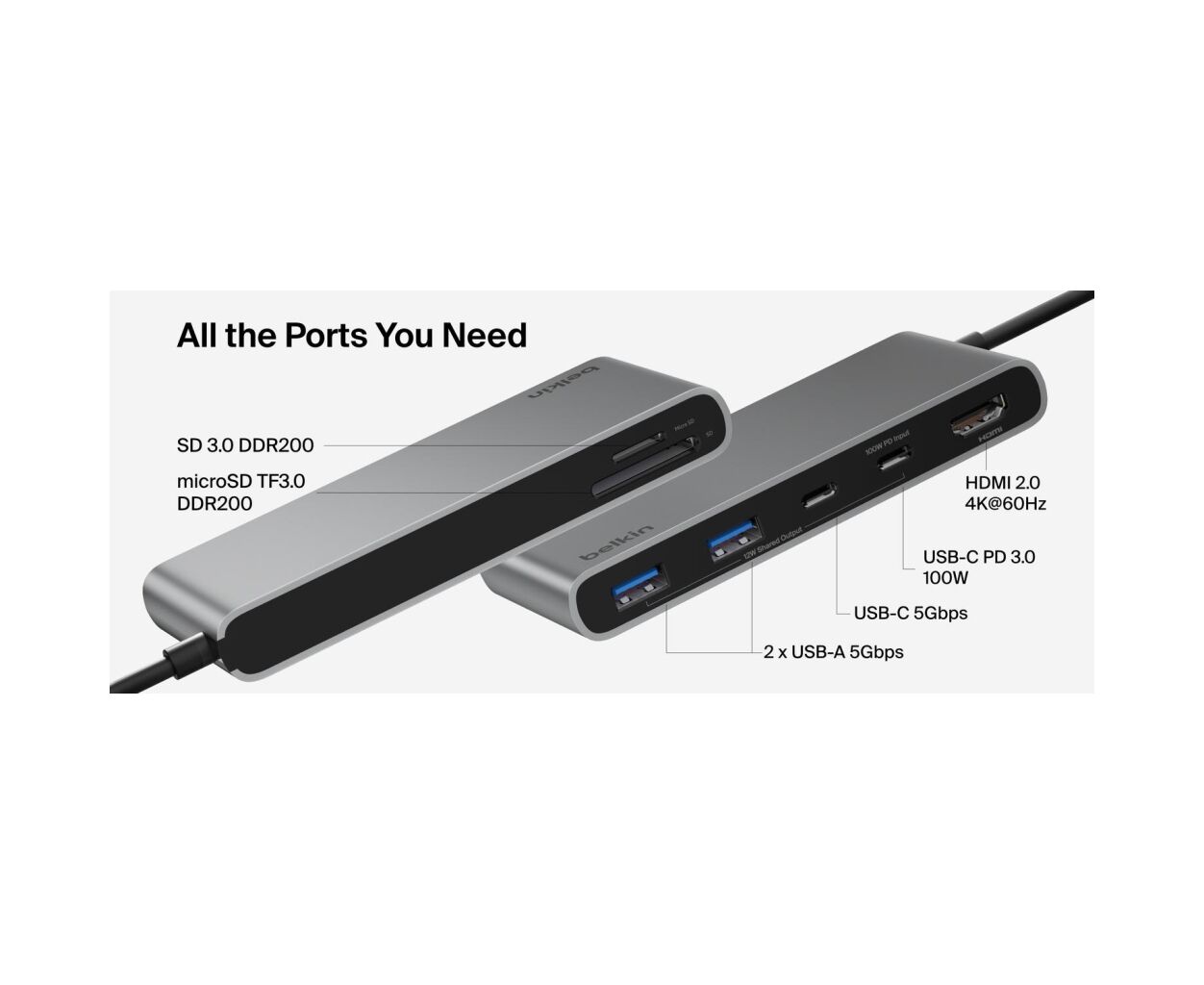 Описание Концентратор Belkin USB-C 7-in-1 2xUSB 3.0 + USB-C + PD + HDMI 2.0 4K60Hz + SD/TF gray (AVC023HQSGY)