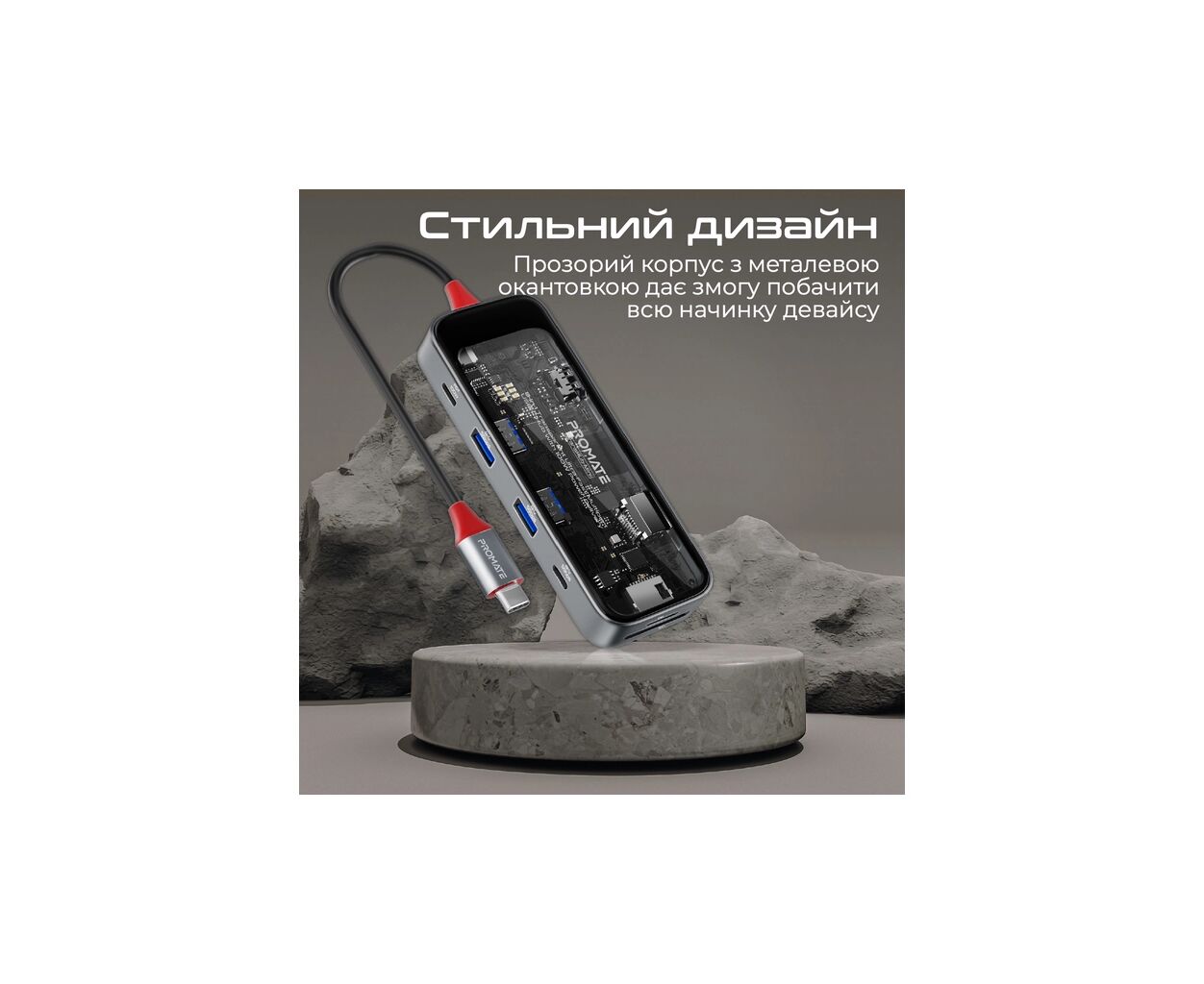 Концентратор Promate USB-C 8-in-1 USB-C PD100W + HDMI 4K60Hz + USBC + 2xUSB 3.0 + RJ45 1000Mbps + SD/MicroSD grey (transhub-mini)