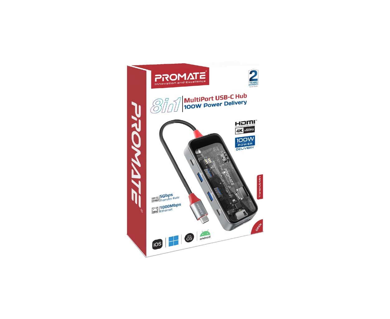 Описание Концентратор Promate USB-C 8-in-1 USB-C PD100W + HDMI 4K60Hz + USBC + 2xUSB 3.0 + RJ45 1000Mbps + SD/MicroSD grey (transhub-mini)