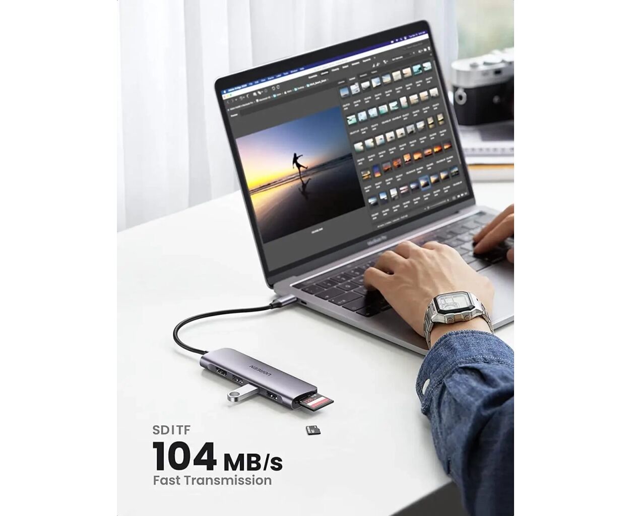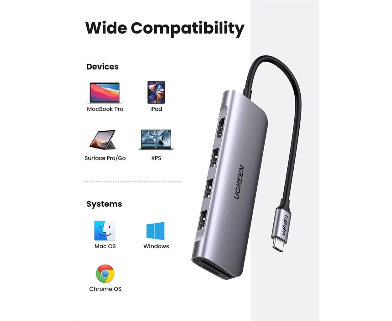 Описание Концентратор Ugreen USB-C to 3xUSB 3.0 + HDMI + SD/TF CM195 gray (70410)