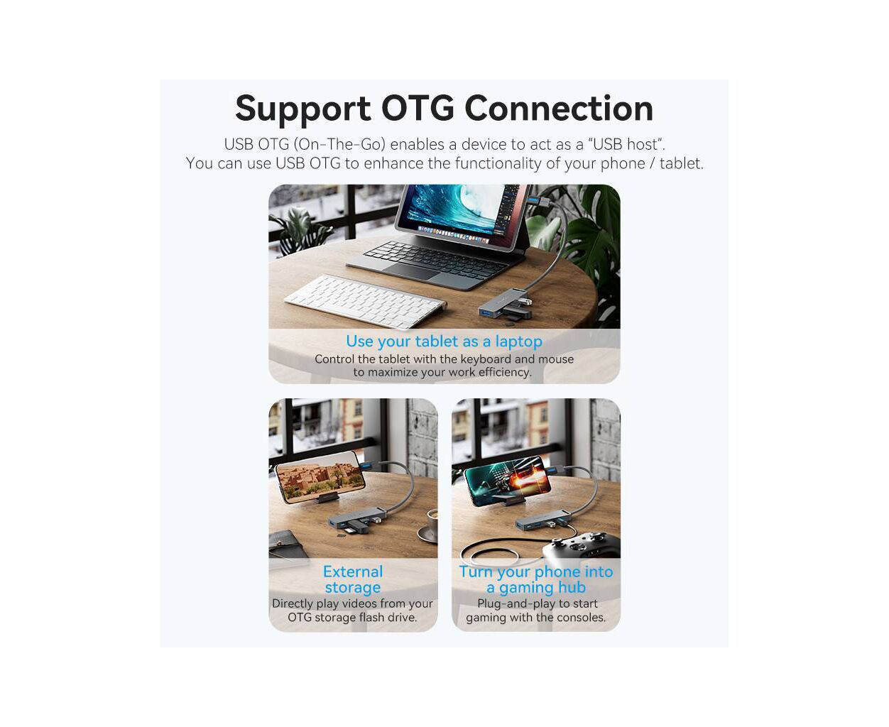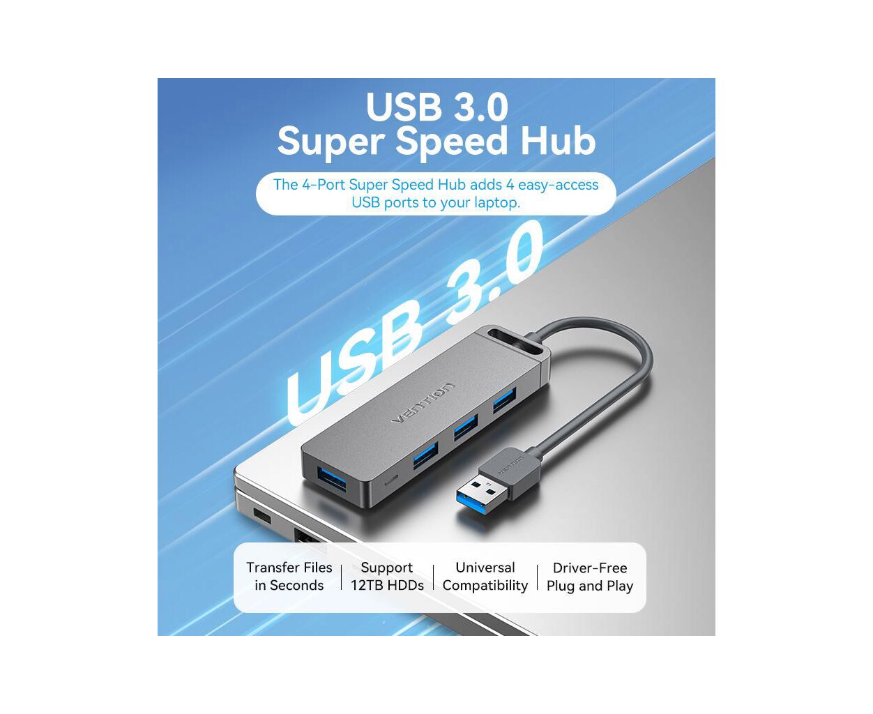 USB хаб Vention позволит владельцам ноутбуков расширить количество доступных разъемов высокоскоростного интерфейса USB 3.0, со скоростью передачи данных до 5 Гбит/с. Хаб Vention позволяет одновременно подключить до четырех устройств с одинаковыми или разными интерфейсами: USB 3.0, USB 2.0, USB 1.1. Вы сможете подключить через него: USB мышь и клавиатуру, USB-флешки, внешний жесткий диск HDD или SSD, видеокамеру, принтер, сканер и другие устройства. Питание адаптера обеспечивается по шине USB, однако для подключения энергоемких устройств, таких как HDD необходимо подключать дополнительное питание, через порт microUSB, расположенный на корпусе хаба. Поддерживает функцию Plug-and-Play и не требует установки драйверов. Работает по технологии OTG.