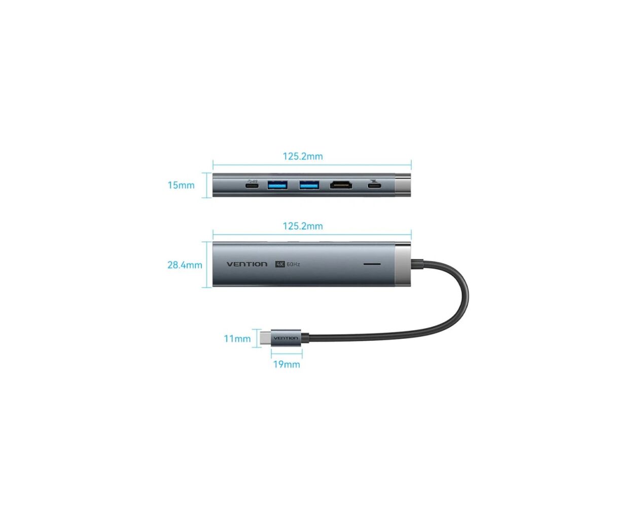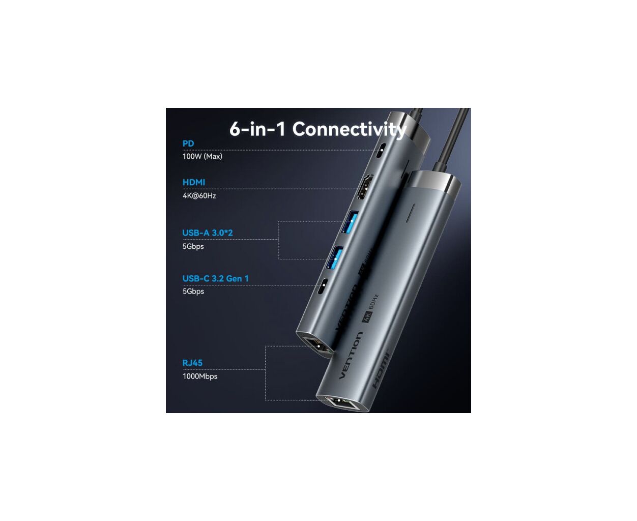 Концентратор VENTION USB-C 6-in-1 HDMI + 2xUSB 3.0 + RJ45 + PD 100W (TGNHB)