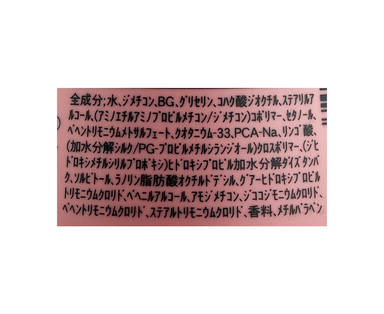 - Water, Dimethicone, BG, Glycerin, Dioctyl Succinate, Stearyl Alcohol, (Aminoethylaminopropyl Dimethicone/Dimethicone) Copolymer, Cetearyl Alcohol, Behentrimonium Methosulfate, Quaternium-33, Sodium PCA, Malic Acid, (Hydrolyzed Silk/PG-Propyl Methylsilaned