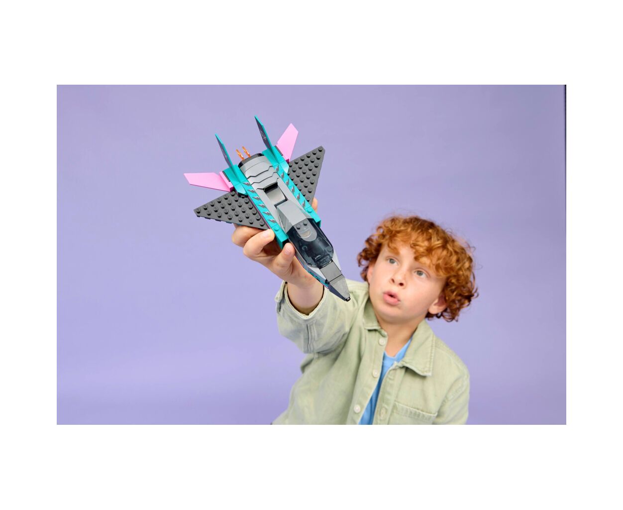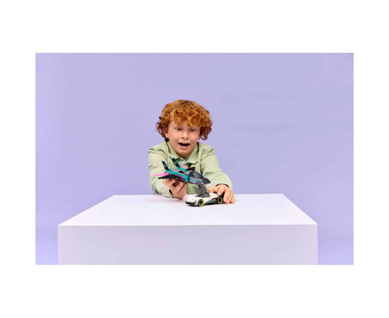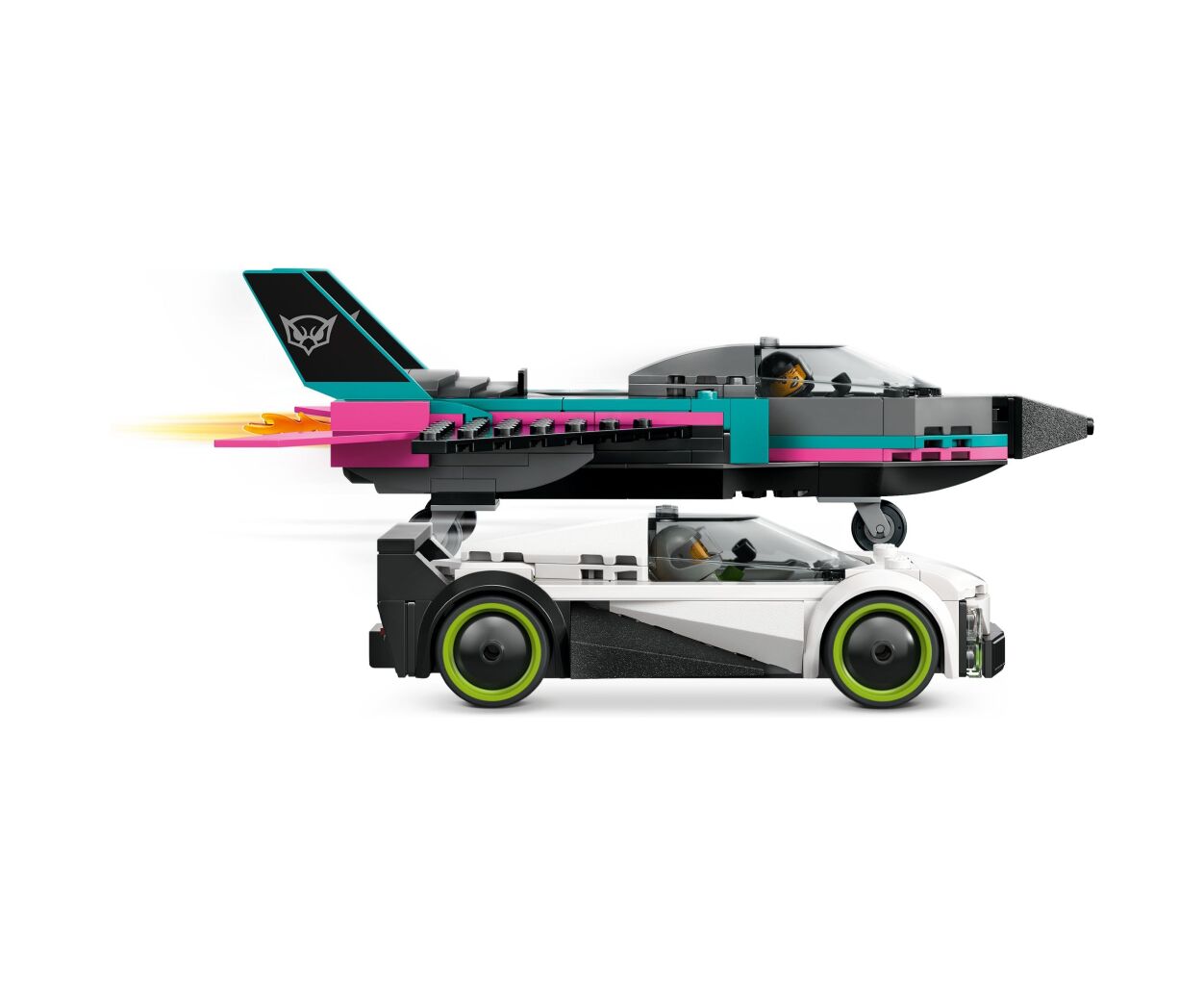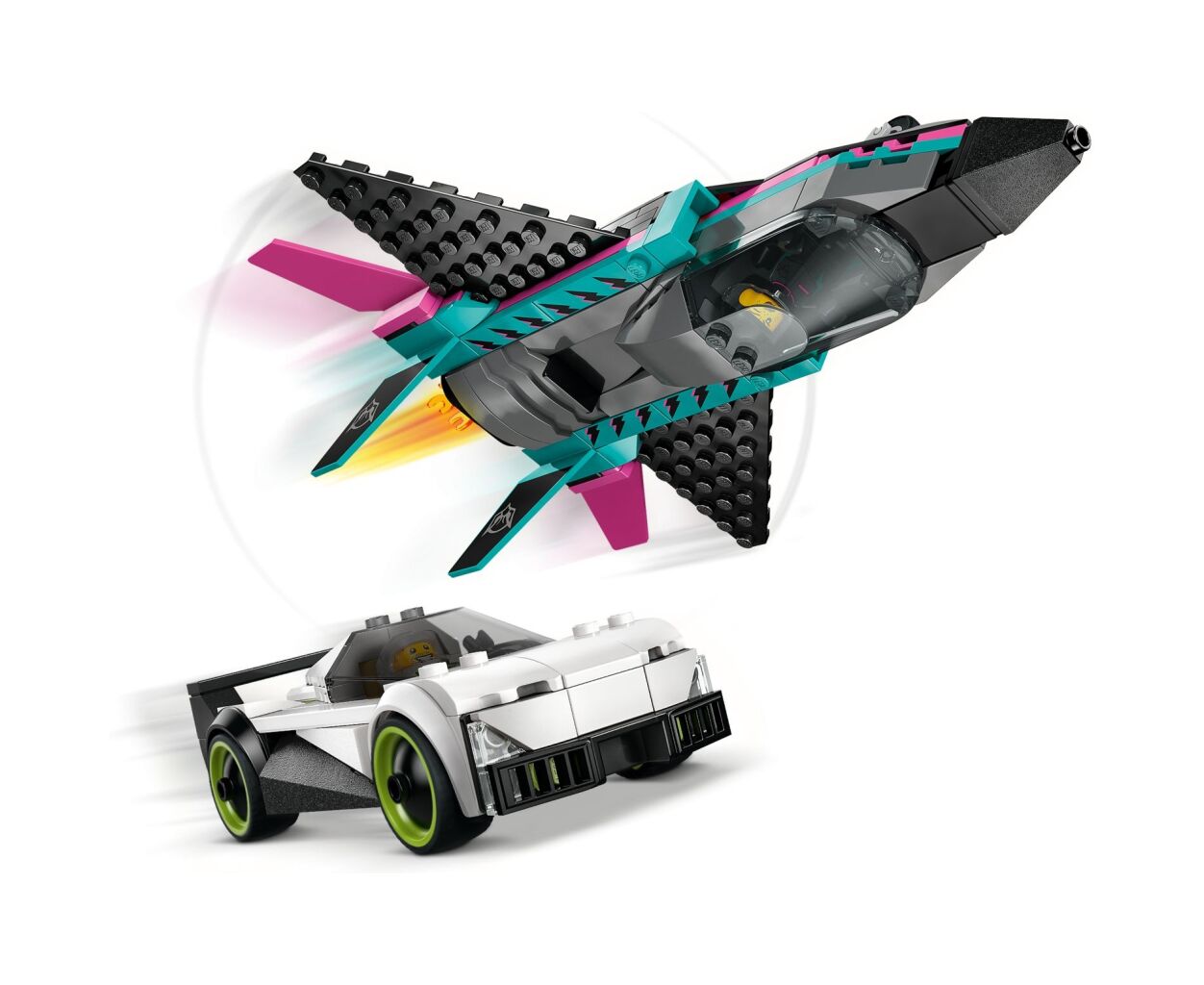 Реактивный самолет оснащен элегантными крыльями, отклоняющимися назад, и двойным вертикальным хвостом, создавая атмосферу настоящей скорости. Маленькие строители могут испытать функцию форсажа, просто передвинув рычаг. Автомобиль в этом наборе впечатляет спортивным стилем и имеет детализированную кабину с гоночным сидением, что обеспечивает максимальное удовольствие от игры.