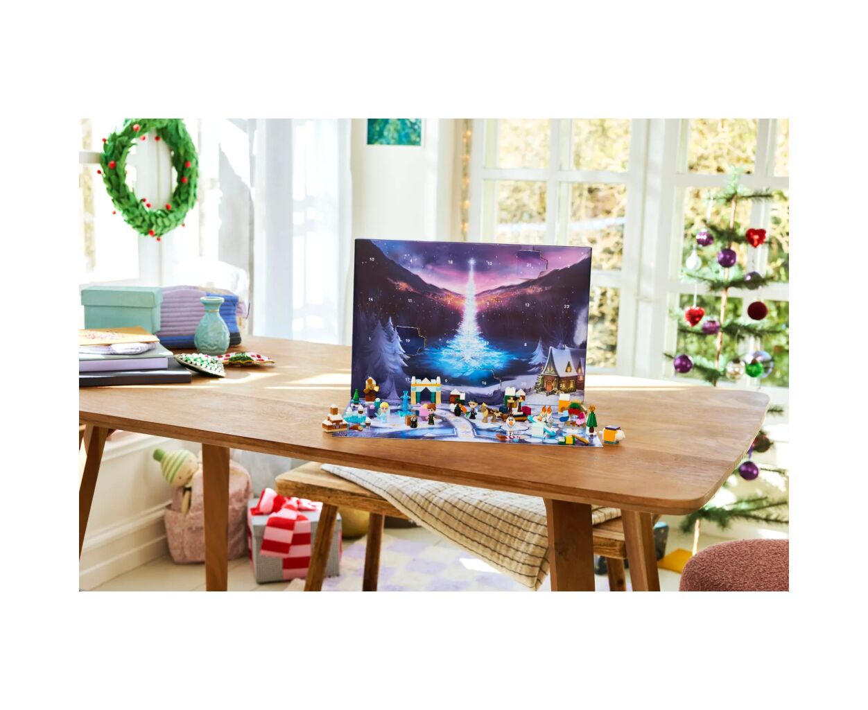 За некоторыми дверцами прячутся игрушки от LEGO® ǀ Disney, в том числе качели, пряничный домик, сэр Йоргенберген, камин с чулками и венком, подарки и множество другого