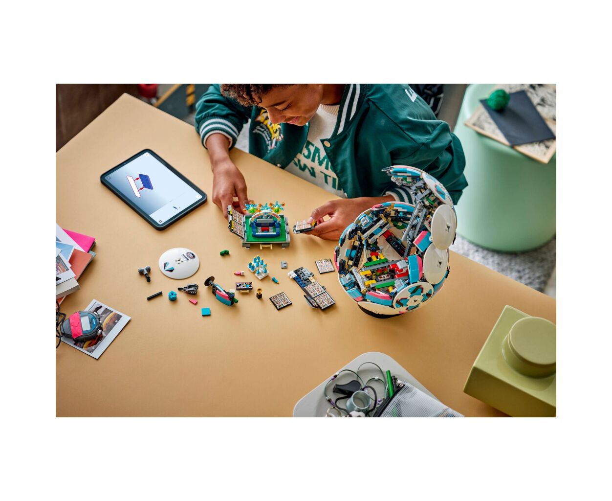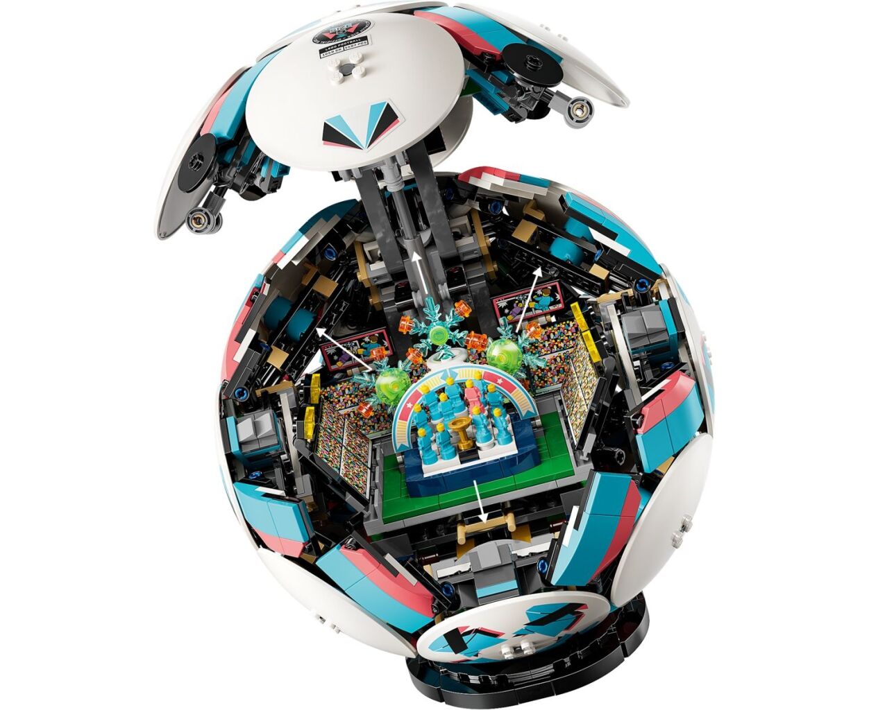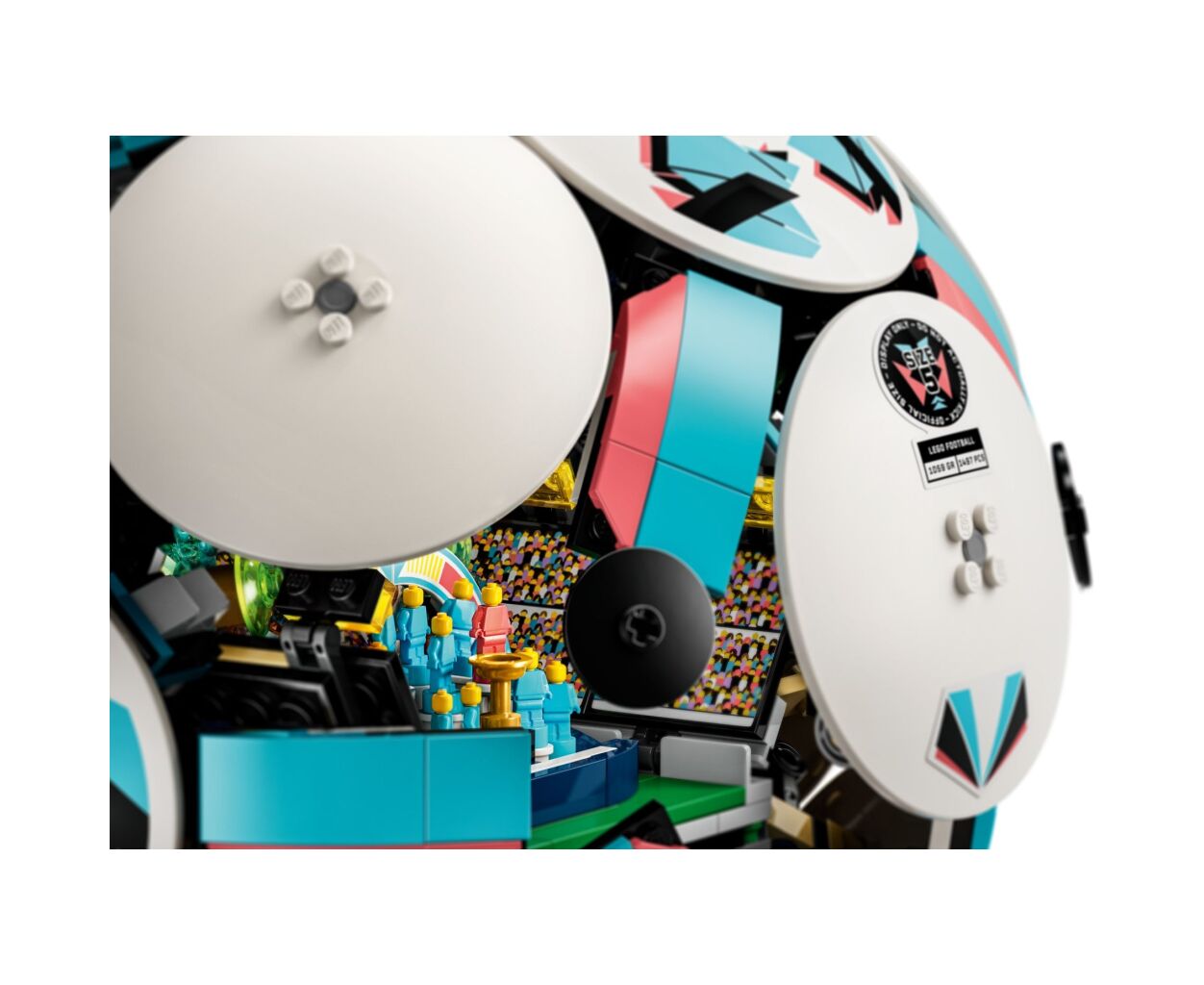 Внутри футбольного мяча LEGO находится движущаяся праздничная сцена на микростадионе.