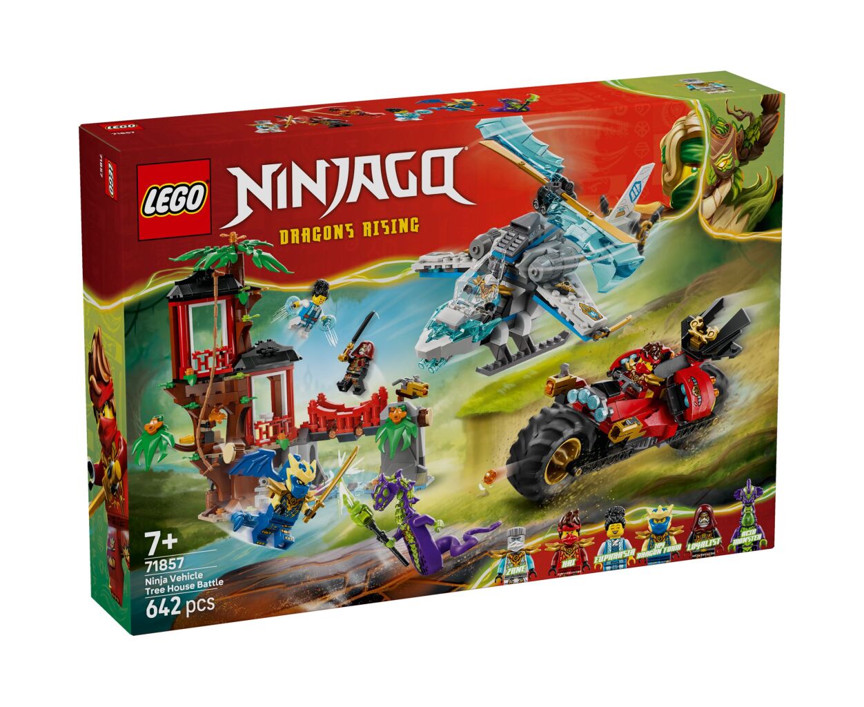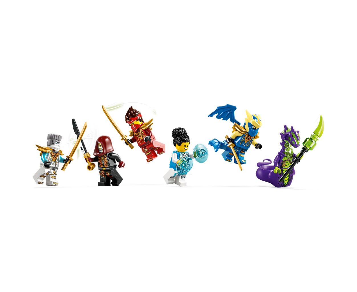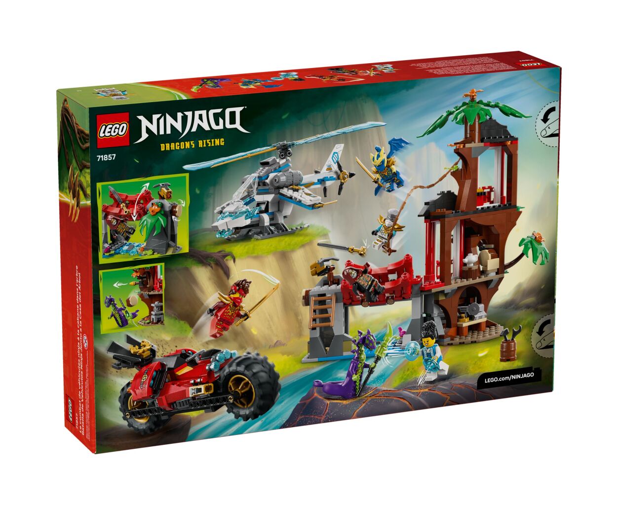 Особенностью набора является игрушечный вертолет с вращающимися лопастями и мотоцикл с подвижными колесами и шутерами. А шесть любимых минифигурок, среди которых Кай, Зейн, Джей и другие, делают игру еще более захватывающей.