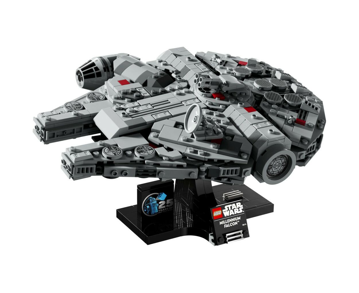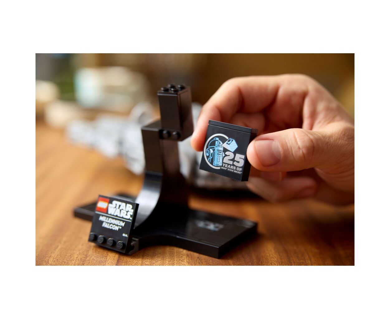 Добавьте табличку с названием и кубик LEGO по случаю 25-летия Звездных войн, чтобы завершить центральный элемент модели, которая непременно пробудит ностальгию.