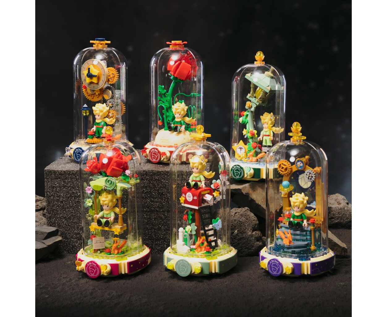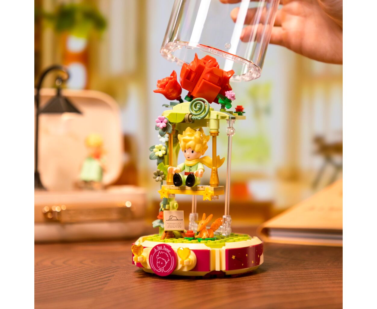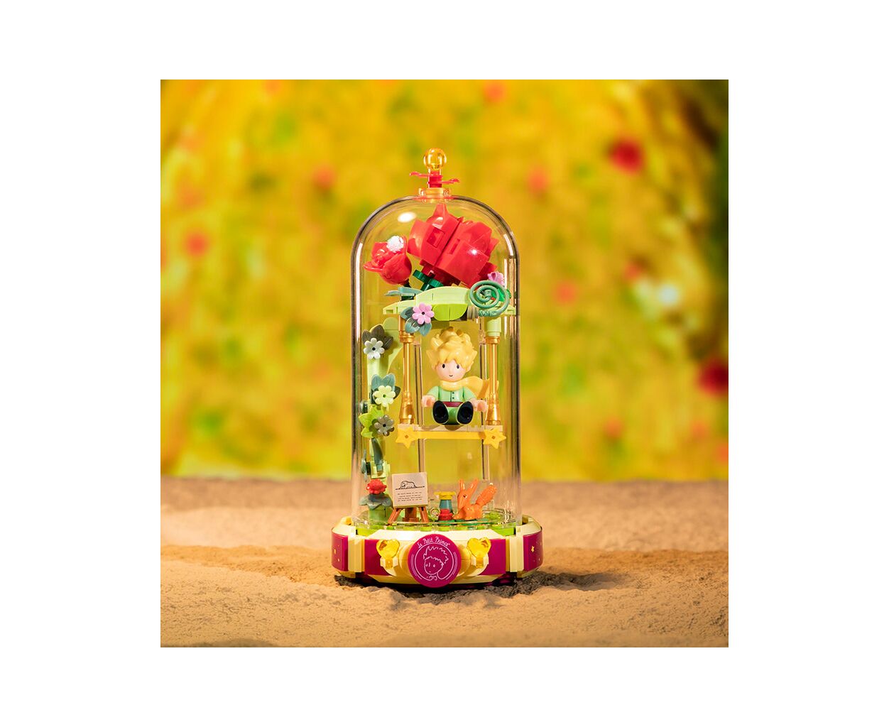 Дизайн конструктора воплощает в жизнь сцену, где маленький принц наслаждается моментом на качелях среди красных роз, которые растут под стеклянным куполом. Эта композиция является символом чистоты, любви и одиночества — основных тем в произведении. Модель изготовлена из высококачественного пластика, что гарантирует долговечность и безопасность во время игры.