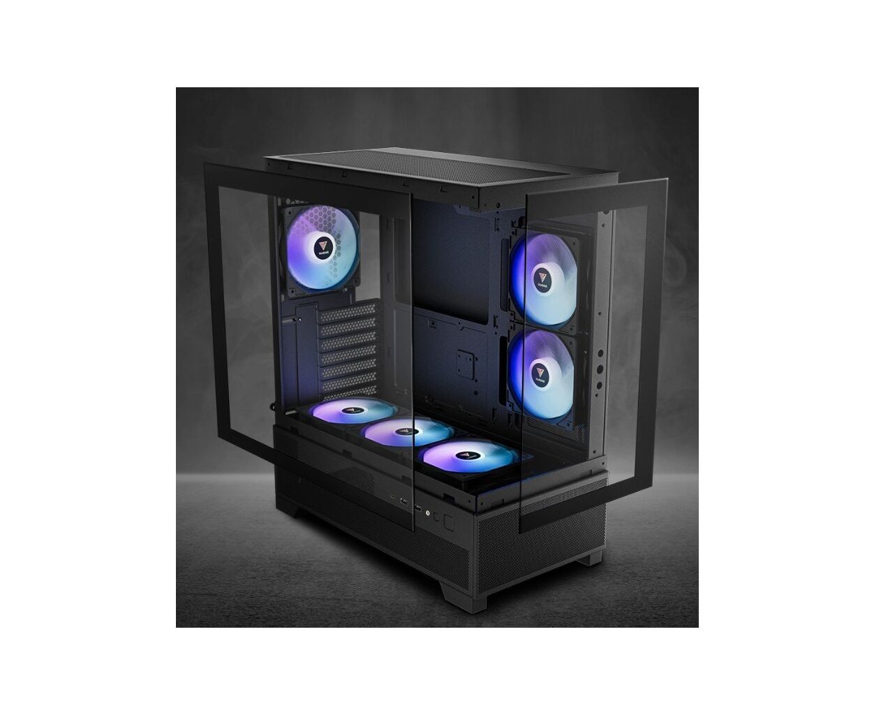 Продуманная конструкция радует глаз своей панорамной передней и боковыми панелями из закаленного стекла, что не только добавляет элегантности, но и позволяет наблюдать за внутренней работой ПК и любоваться всей палитрой ARGB подсветки, установленной на шести 120 мм вентиляторах. Эта особенность не только подчеркивает красоту, но и обеспечивает отличный воздушный поток, гарантируя оптимальное охлаждение компонентов системы.