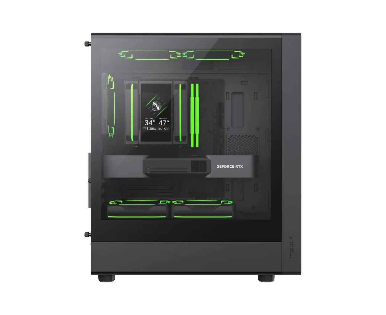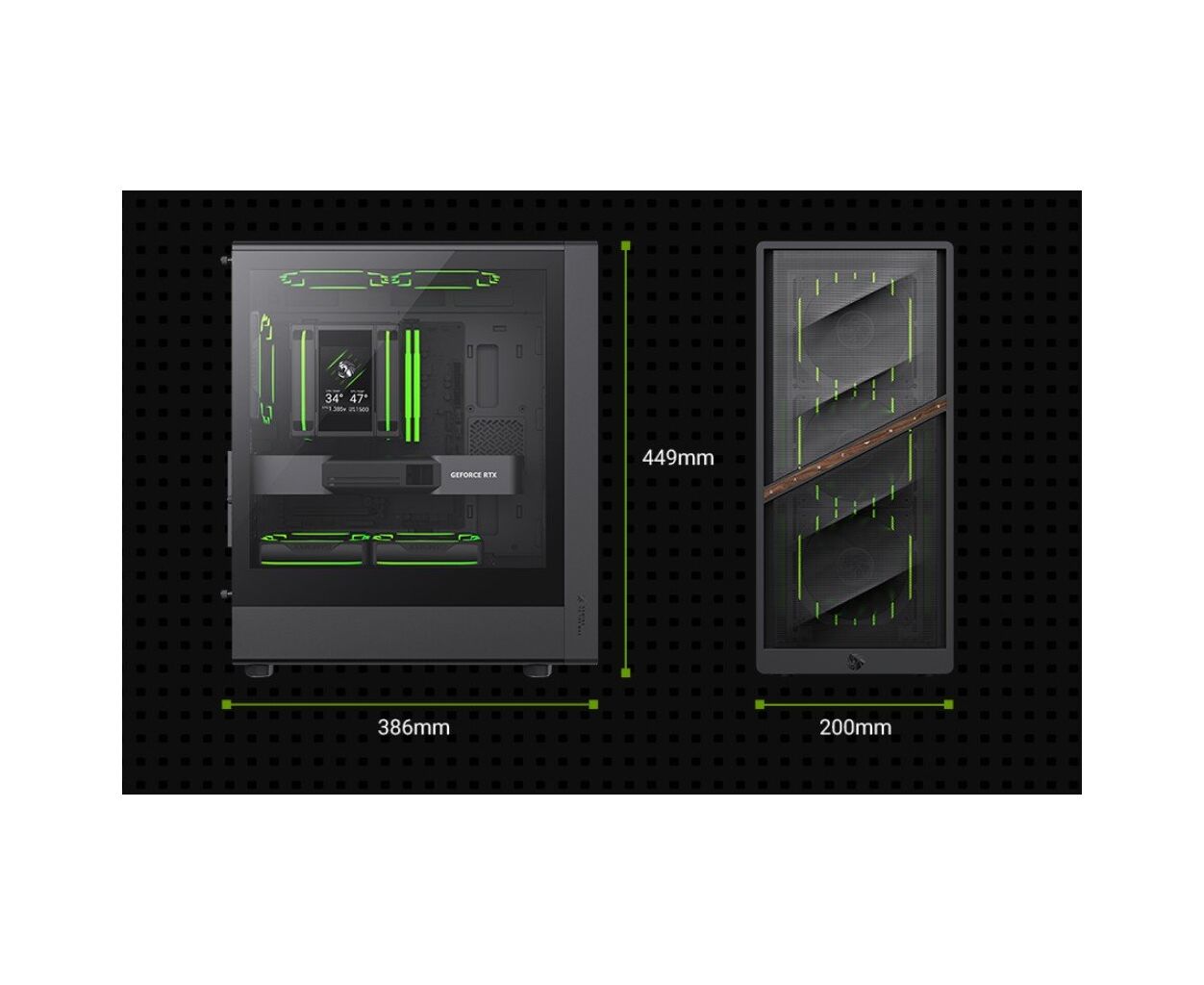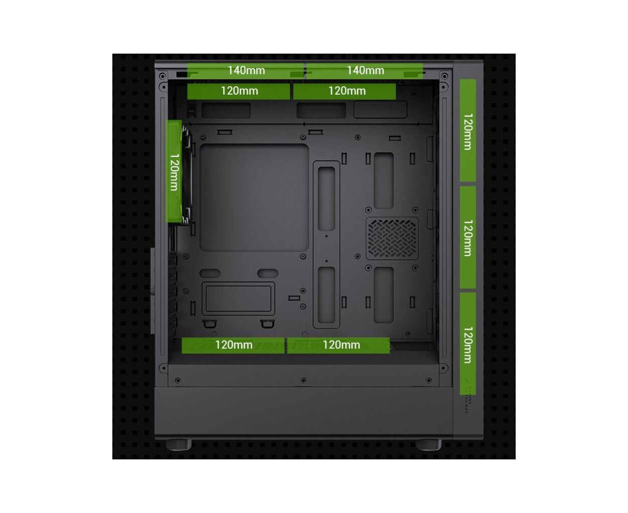 Эффективность охлаждения – часть, на которую разработчики обратили особое внимание. Передняя панель с Airflow-Mesh конструкцией обеспечивает отличный воздушный поток, а реализованные отверстия для прокладки кабелей и другие особенности гарантируют максимальную скорость теплоотдачи. Поддержка жидкостного охлаждения и возможность установки до 8 120-мм вентиляторов (с четырьмя установленными ARGB/PWM) обеспечивают отличный контроль температуры даже при самых интенсивных нагрузках.