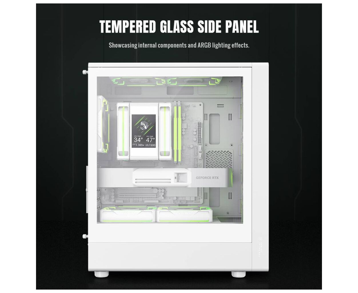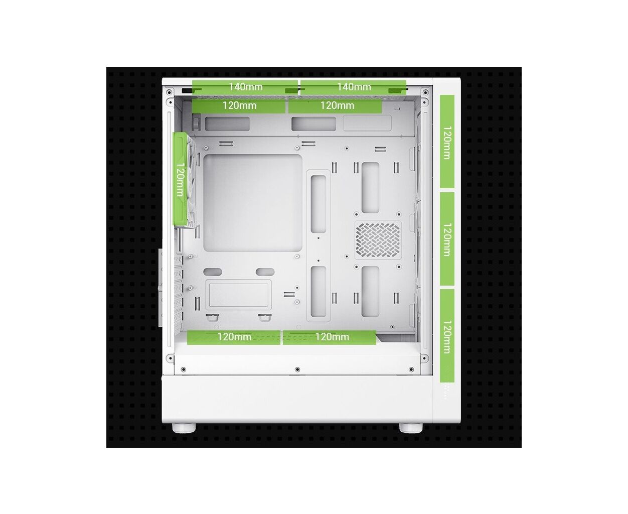 Система охлаждения в этом корпусе заслуживает особого внимания. Благодаря передней сетчатой панели с высоким коэффициентом воздушного потока и вертикальному расположению компонентов, теплоотвод значительно оптимизирован. В корпусе можно размещать до восьми 120-мм вентиляторов, четыре из которых уже установлены как 120-мм ARGB/PWM вентиляторы. Это позволяет организовать синхронизированное освещение и оптимизировать воздушный поток во всей системе.