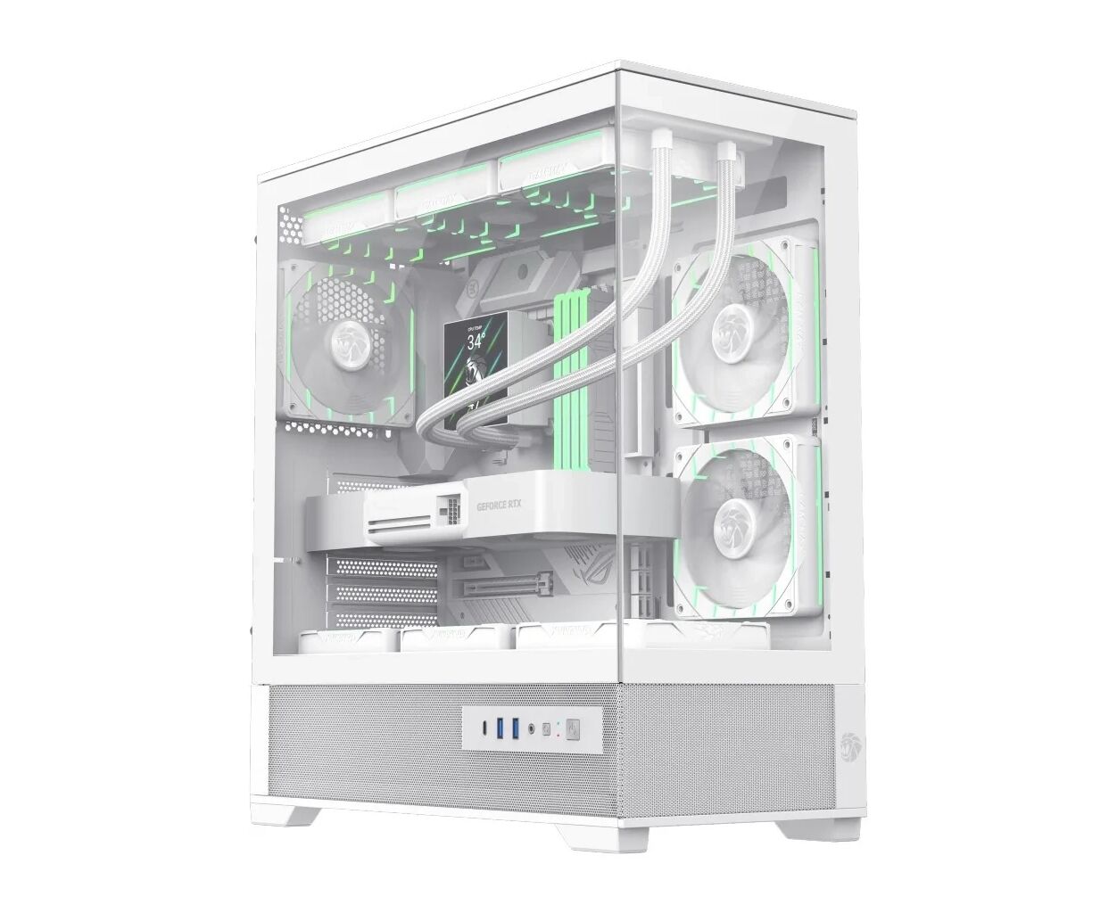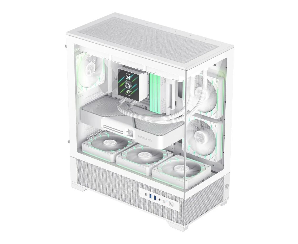 Одним из самых ярких элементов дизайна является панорамное закалённое стекло с углом обзора 270°, которое открывает великолепие внутренней компоновки и позволяет любоваться его ARGB-подсветкой. Три предварительно установленных вентилятора с управляемой подсветкой создают не только захватывающий визуальный эффект, но и эффективное охлаждение системы. Дополнительные отверстия для укладки кабелей позволяют сохранять аккуратность интерьера вашего ПК.