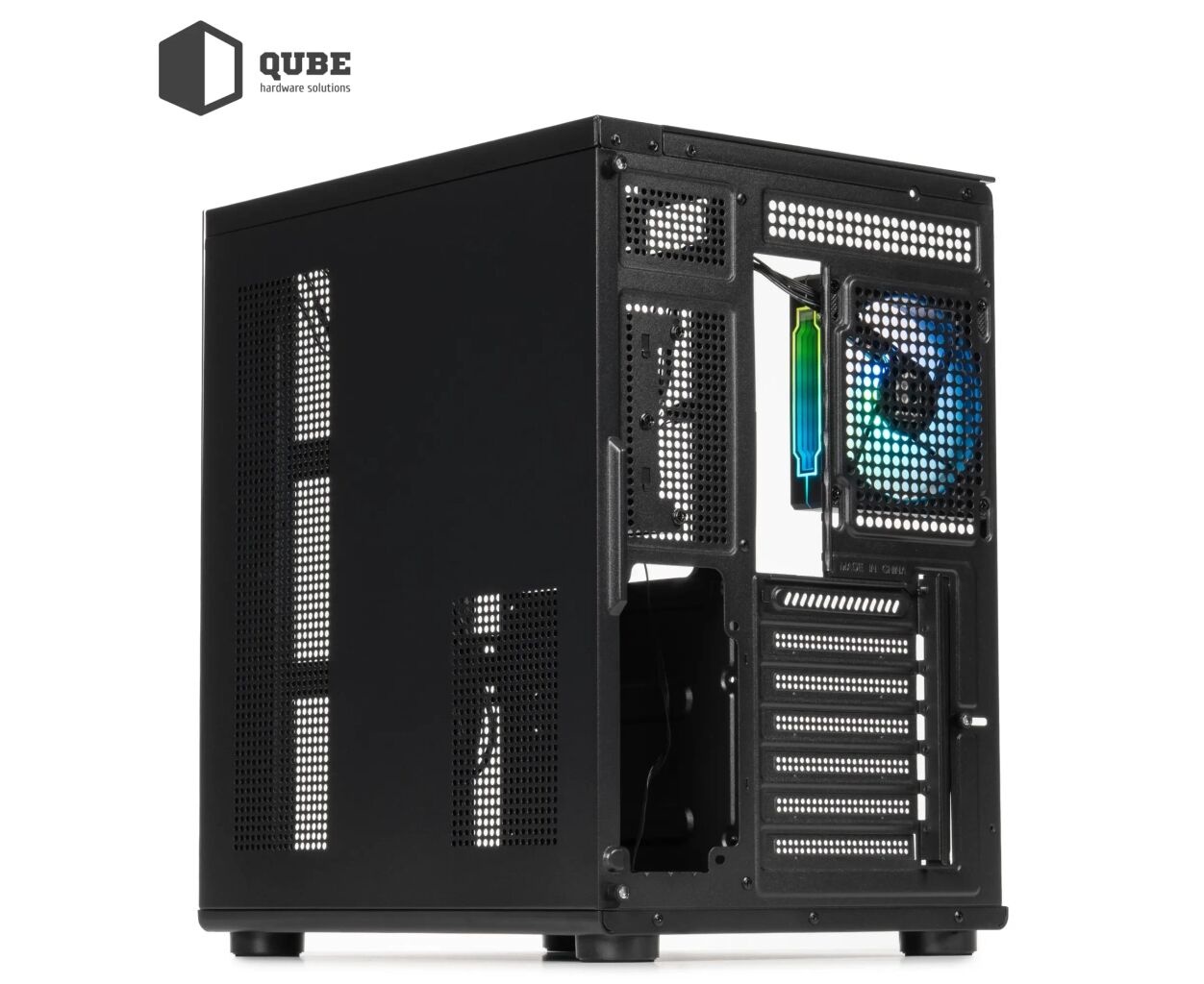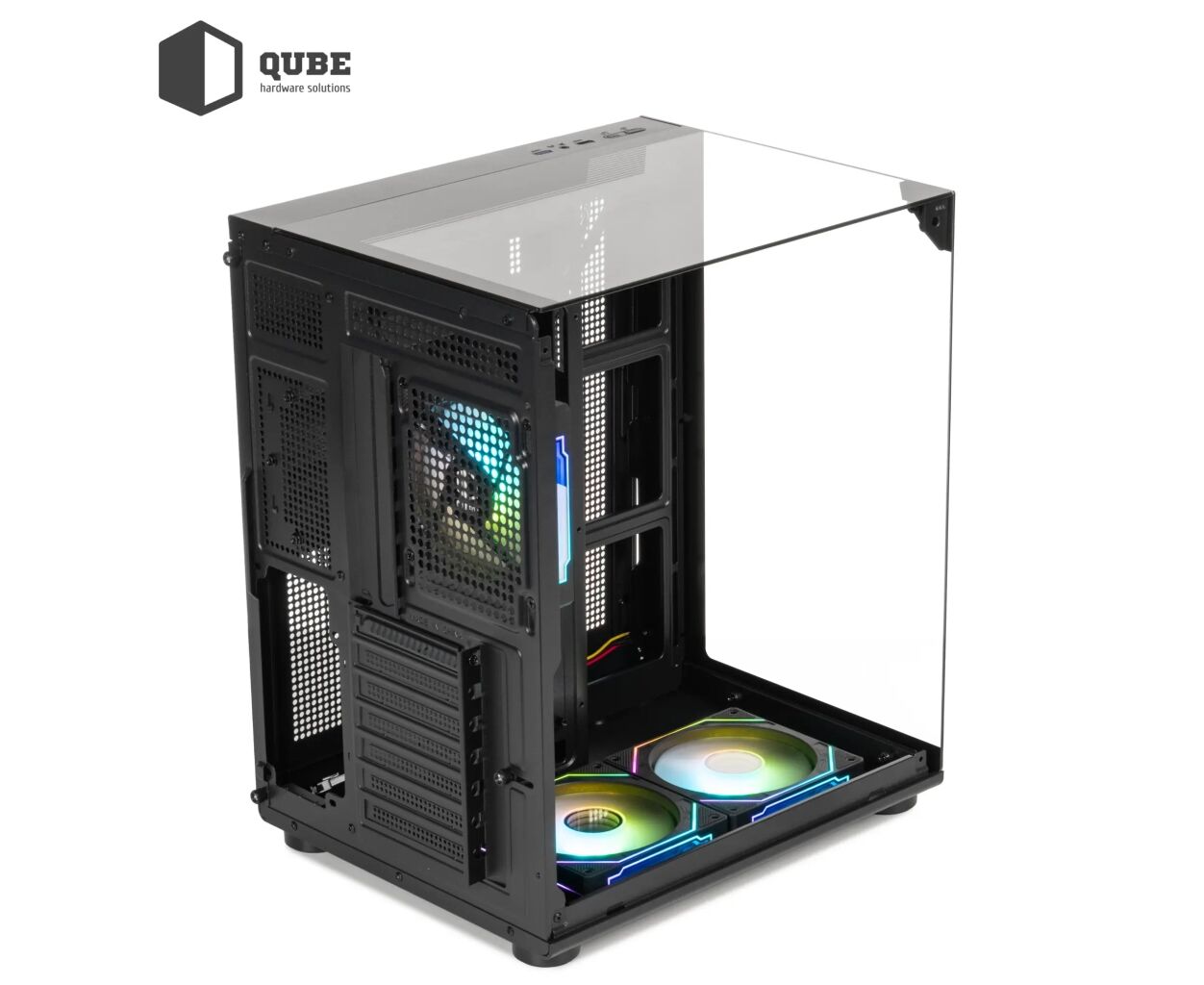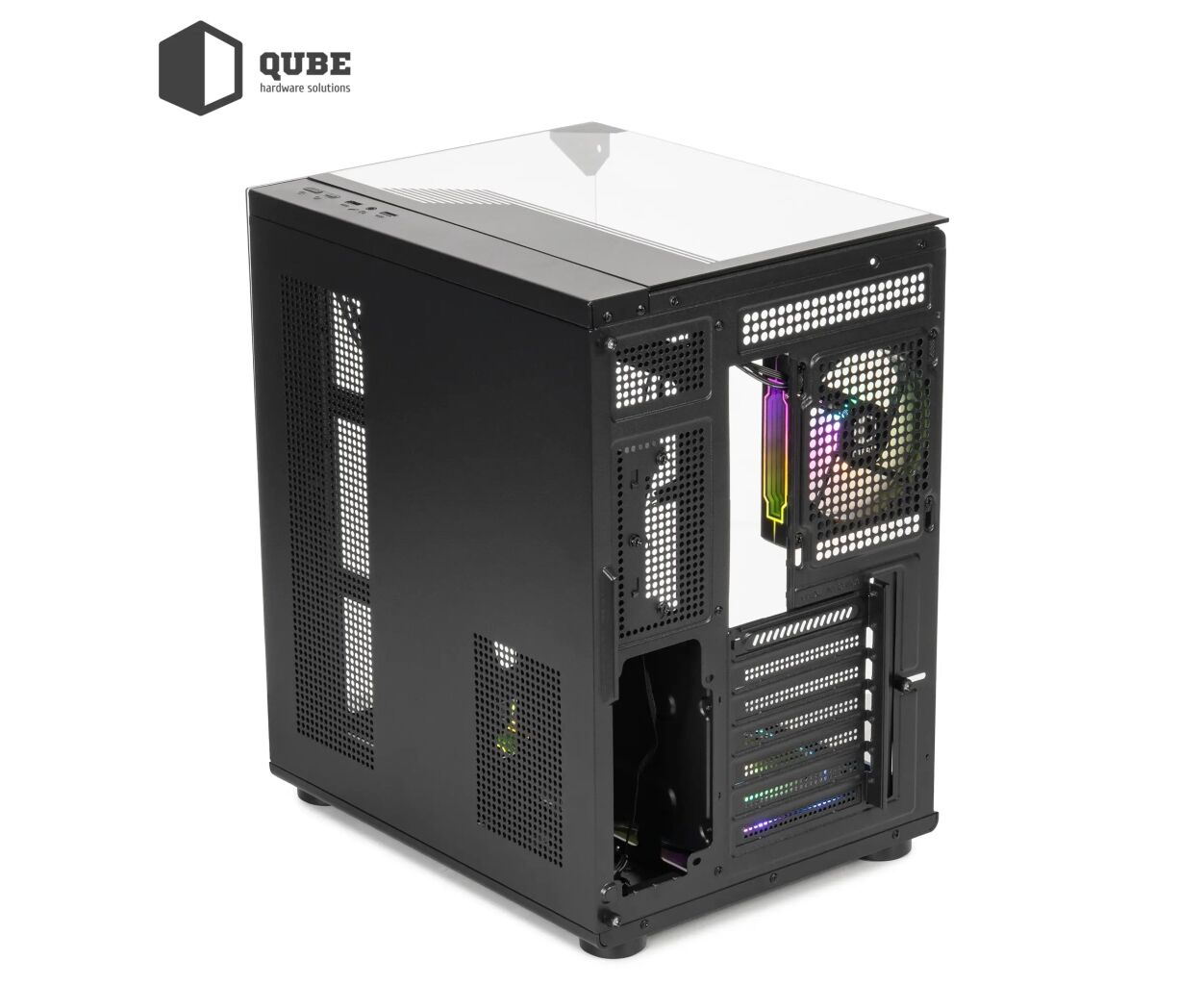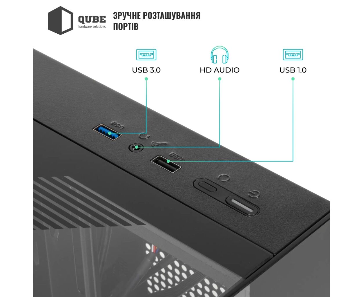 Корпус QUBE AQUARIUM ARGB Black (AQUARIUM_GBNU3) є компактним і сучасним рішенням для складання ПК, яке поєднує в собі стильний зовнішній вигляд і продуману функціональність. Конструкція виконана з міцної сталі SPCC товщиною 0,45–0,55 мм, а фронтальна і бокова панелі виготовлені зі загартованого скла, що дозволяє не тільки захистити комплектуючі, але й демонструвати їх у всій красі. Габарити корпусу становлять 339×275×392 мм, що робить його досить компактним для зручного розміщення, при цьому він підтримує материнські плати формату ATX, microATX і ITX. Для зберігання даних передбачено два відсіки під SSD і один під HDD, а 7 слотів розширення дозволяють встановлювати додаткові комплектуючі без обмежень.