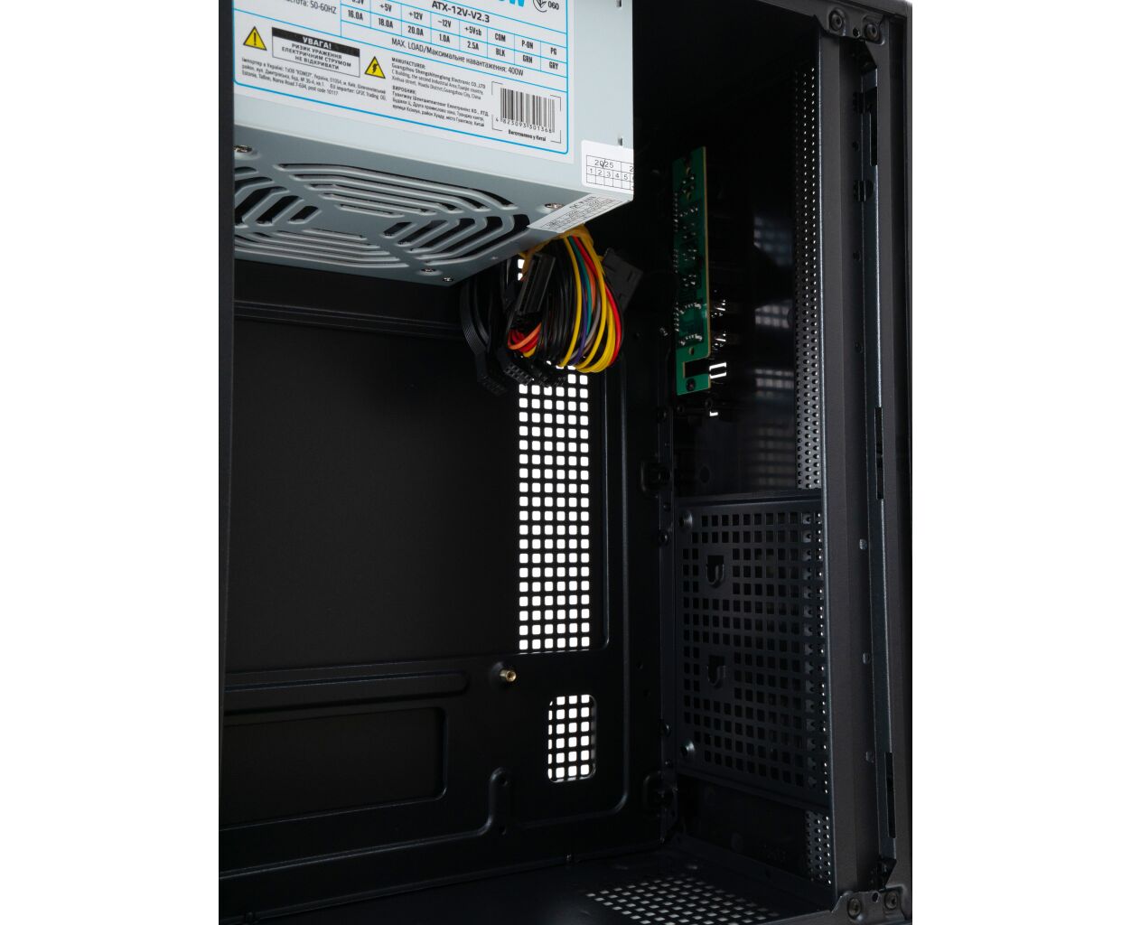 Одним из ключевых преимуществ этого корпуса является наличие интегрированного блока питания мощностью 400 Вт, расположенного сверху. Это обеспечивает надежное и стабильное питание всех компонентов вашего компьютера. Расположение блока питания в верхней части корпуса помогает оптимизировать циркуляцию воздуха и поддерживает охлаждение системы.