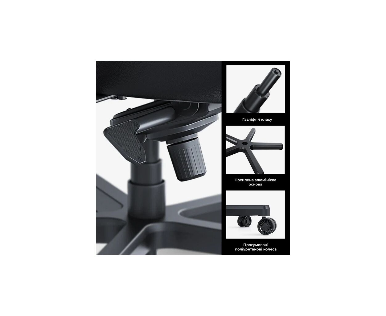 Спинка кресла отклоняется на 135°, а режим качания позволяет наклониться на дополнительные 15°. Газлифт 4-го класса обеспечивает плавную регулировку высоты на 6.5 см, что подходит для пользователей ростом от 150 до 210 см.
