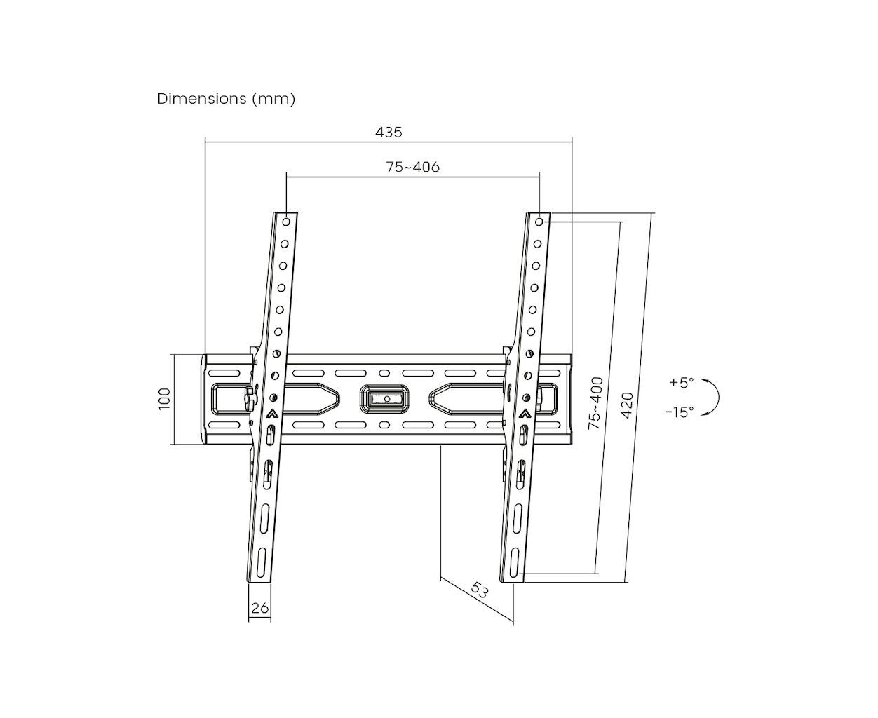 для телевизора, Тип - наклонный, количество степеней свободы - 1, минимальная поддерживаемая диагональ - 32", максимальная поддерживаемая диагональ - 55", VESA - 75 x 75, 100 x 100, 200 x 100, 200 x 200, 200 x 300, 300 x 200, 200 x 400, 300 x 300, 400 x 200, 400 x 300, 400 x 400, 100 x 200, 300 x 400, Максимальная нагрузка - 45 кг, Наклон - +5°~-15°, расстояние от стены - 27 мм, с пузырьковым уровнем, черный