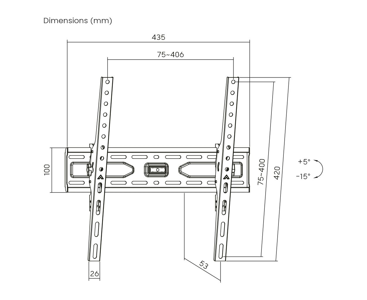 количество степеней свободы - 1, минимальная поддерживаемая диагональ - 55", максимальная поддерживаемая диагональ - 55", VESA - 75 x 75, 100 x 100, 150 x 100, 200 x 100, 200 x 200, 200 x 300, 300 x 200, 200 x 400, 300 x 300, 400 x 200, 400 x 300, 400 x 400, 100 x 150, 150 x 150, 300 x 400, 1100 x 200, Максимальная нагрузка - 45 кг, Наклон - +5°~-15°, расстояние от стены - 53 мм, с пузырьковым уровнем