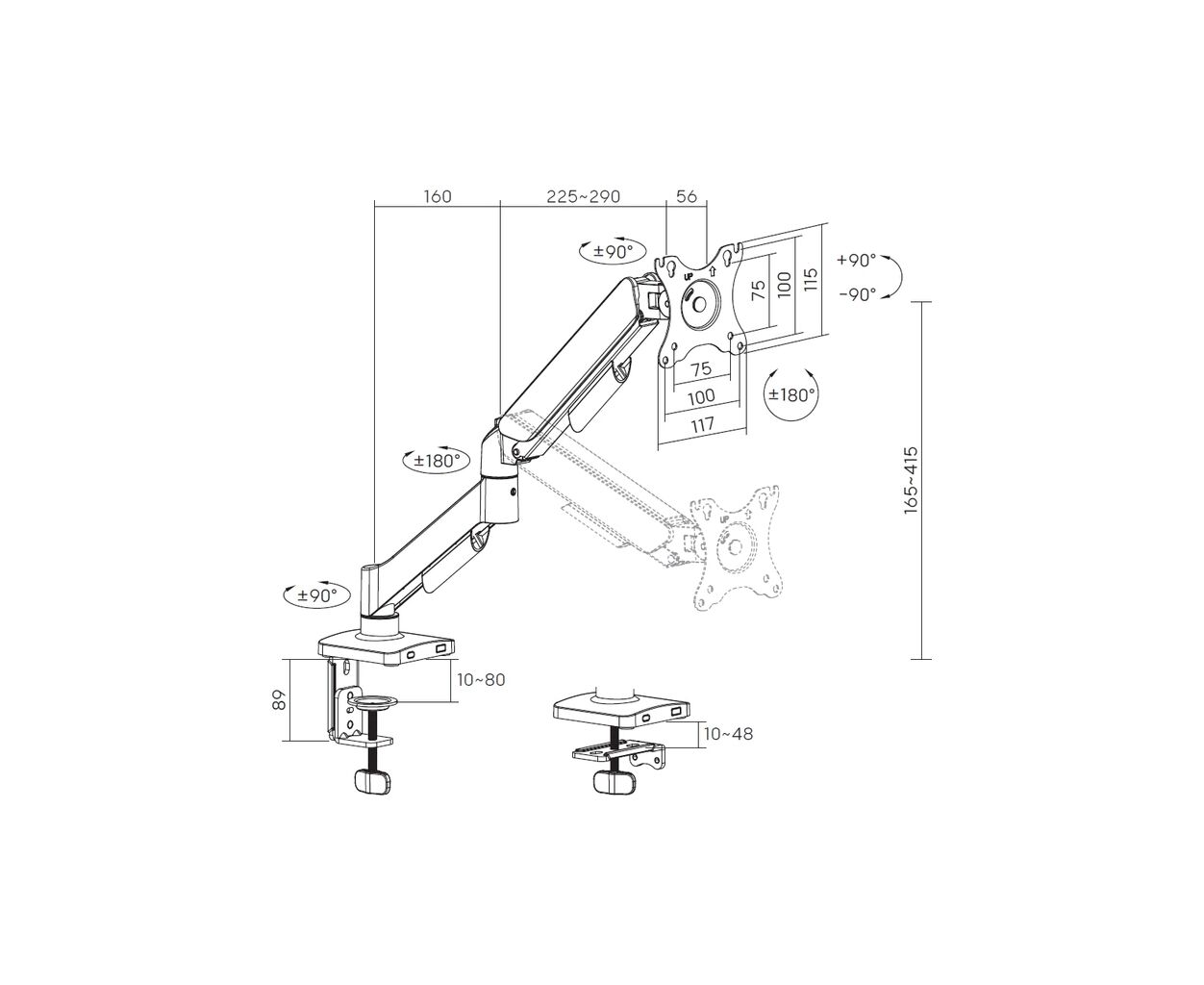 для монитора, Тип - поворотно-наклонный, количество степеней свободы - 5, минимальная поддерживаемая диагональ - 17", максимальная поддерживаемая диагональ - 32", VESA - 75 x 75, 100 x 100, Максимальная нагрузка - 9 кг, Наклон - +90°~-90°, Поворот - 180°, Вращение - 90°, кронштейн, инструкция, монтажный комплект, черный