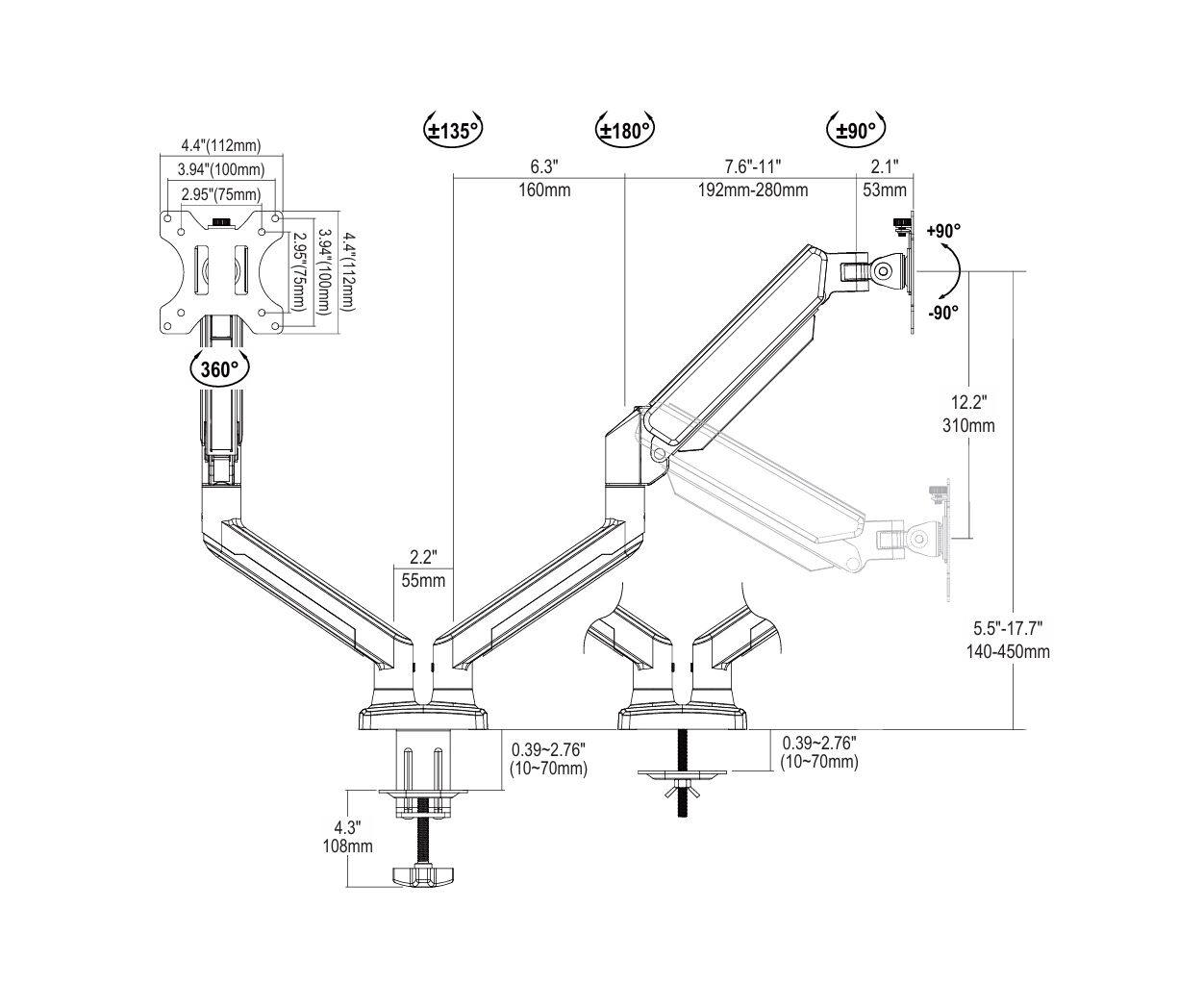 для монитора, Тип - поворотно-наклонный, минимальная поддерживаемая диагональ - 10", максимальная поддерживаемая диагональ - 32", VESA - 75 x 75, 100 x 100, Максимальная нагрузка - 10 x 2 кг, Наклон - -45°~+90°, Поворот - 360°, Вращение - 360, кронштейн, монтажный комплект, инструкция, упаковка, черный