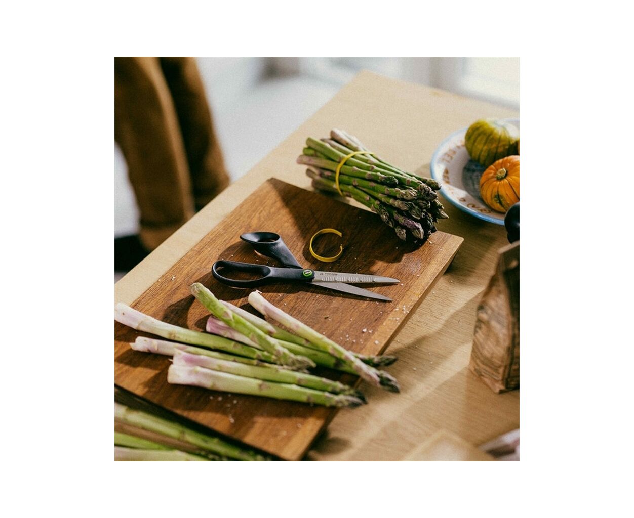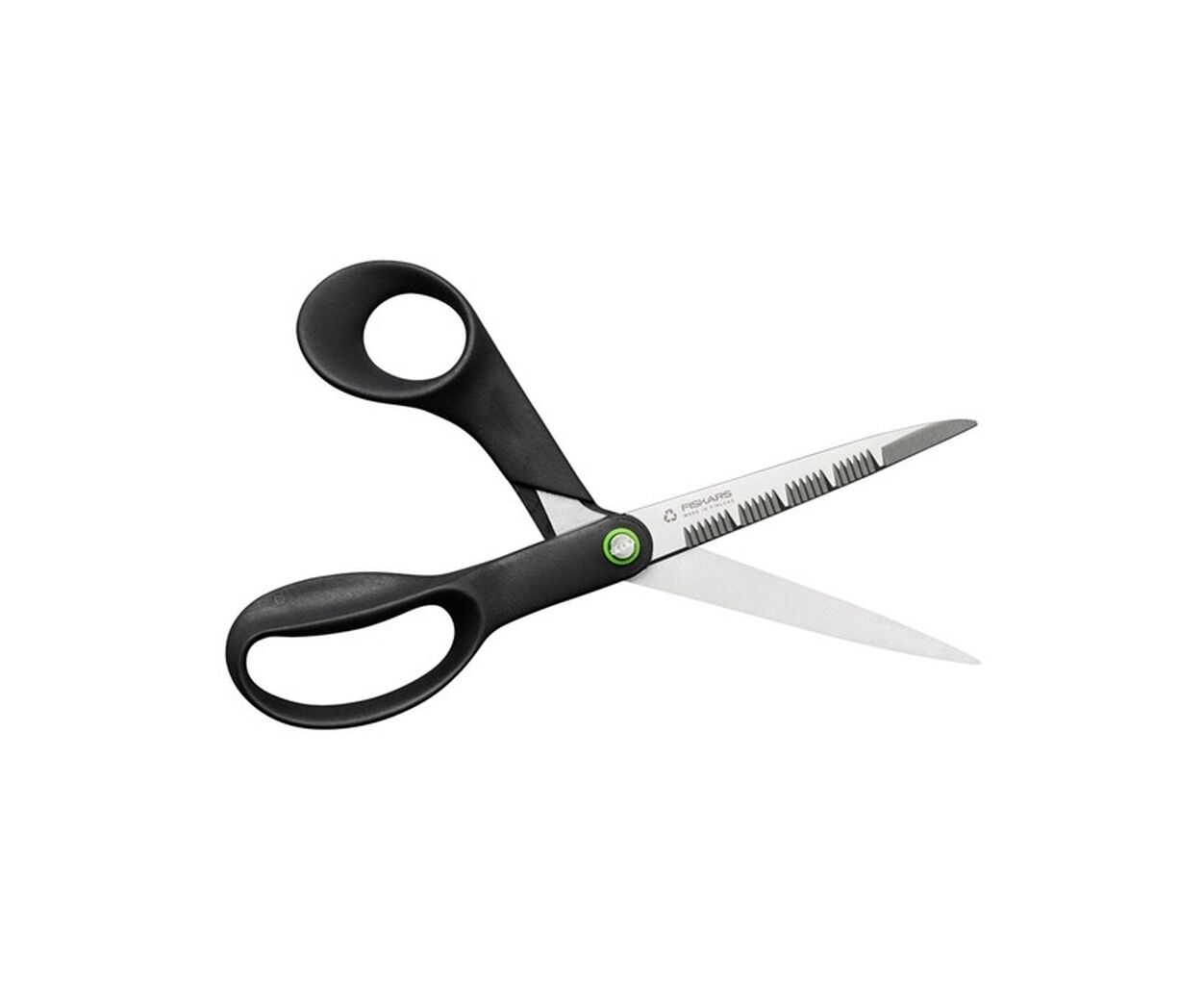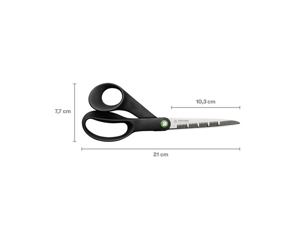 Кухонные ножницы Fiskars Functional Form ReNew (21 см) с зубчатыми лезвиями из нержавеющей стали. Изготовлены из переработанных материалов, прочные и экологичные.