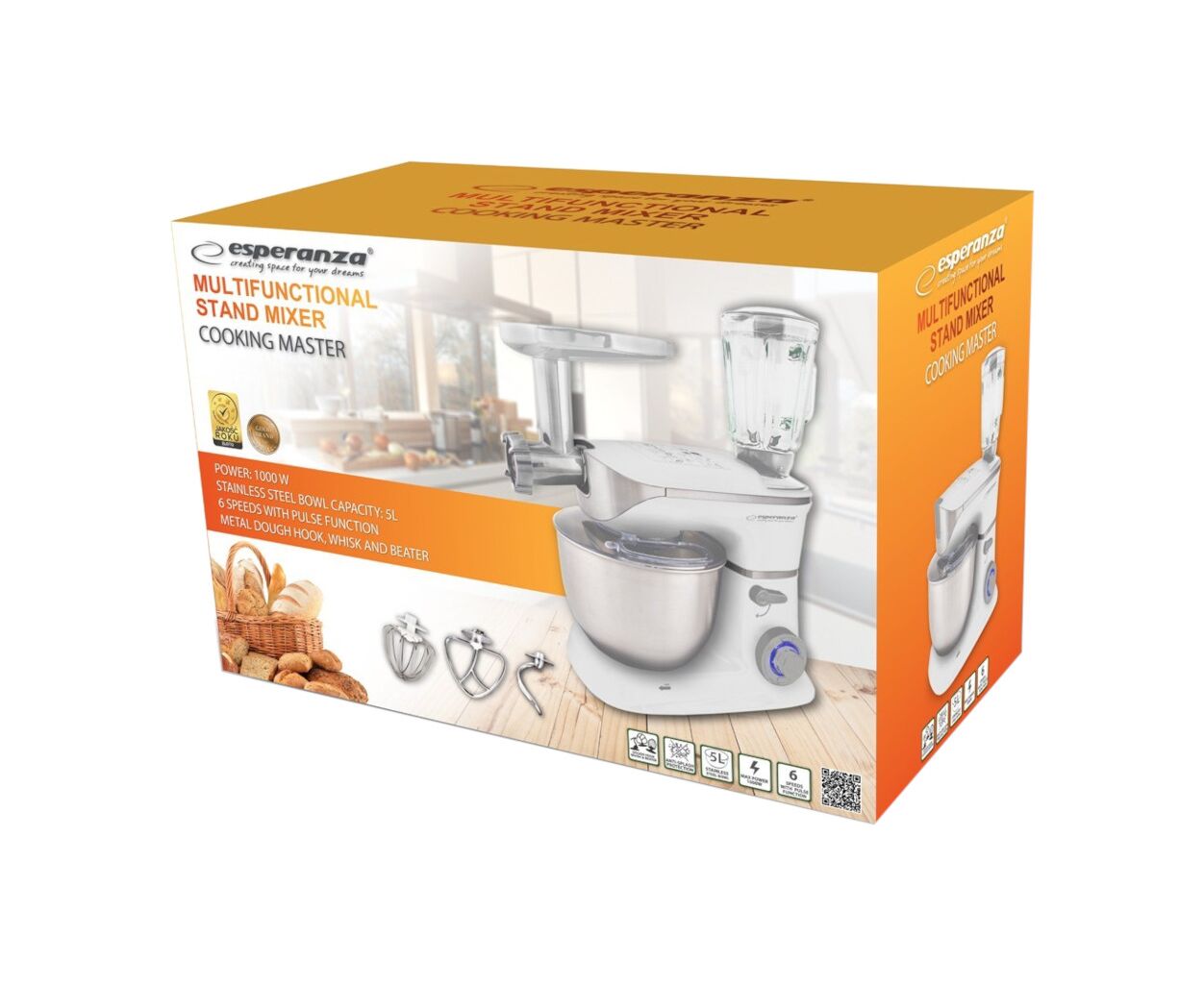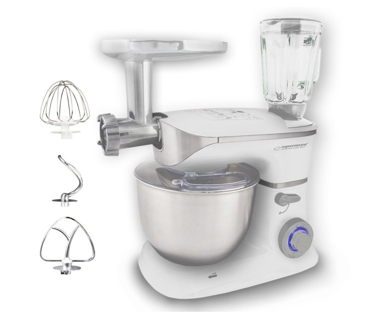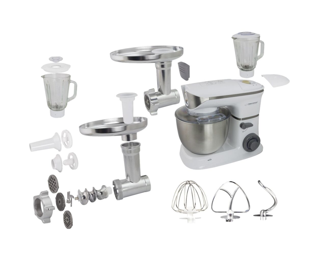 Тип - кухонный комбайн, мощность - 1000 Вт, объем основной чаши - 5 л, объем чаши блендера - 1.5 л, функции - смешивание, замешивание теста, блендер, мясорубка, габариты - 53 х 45 х 23.3 см, Цвет - белый