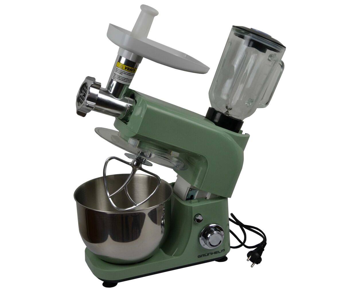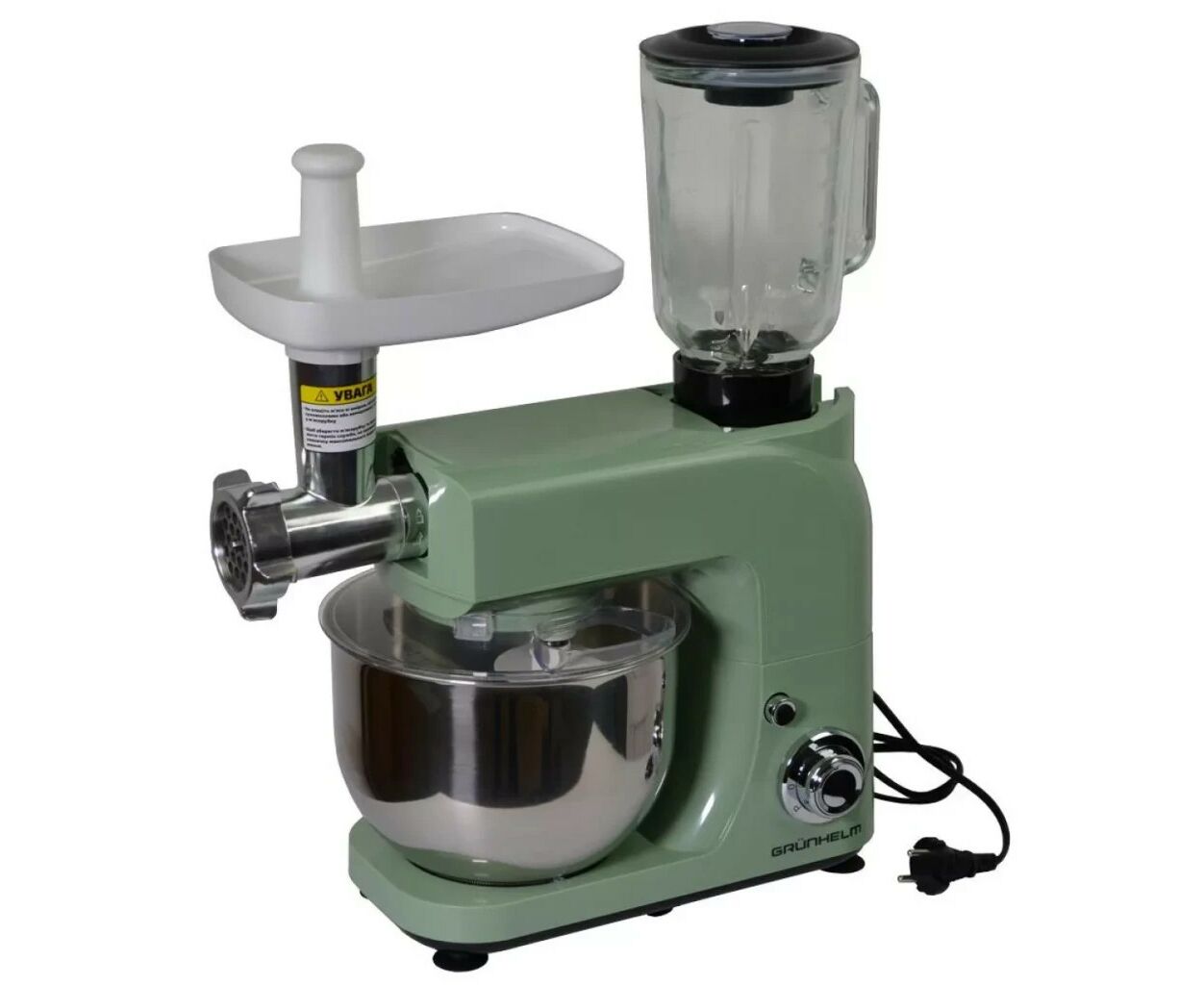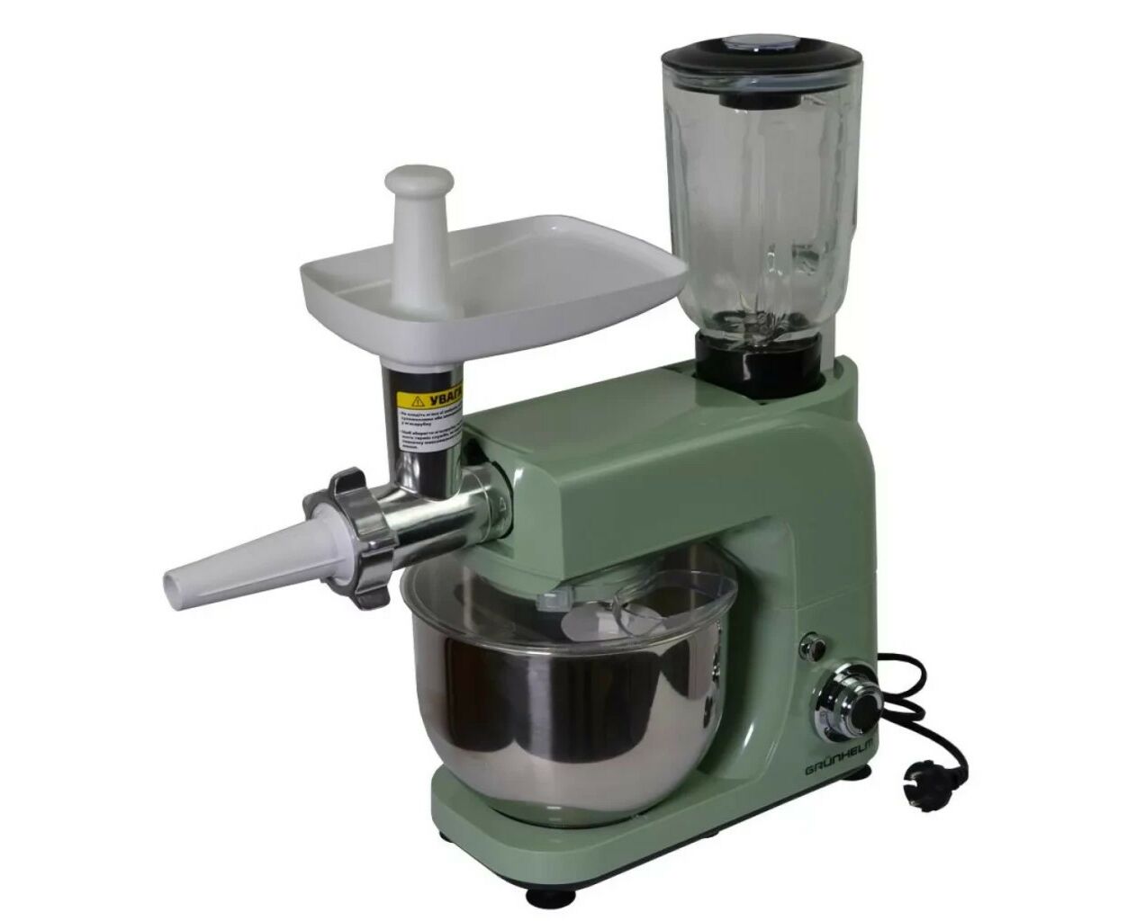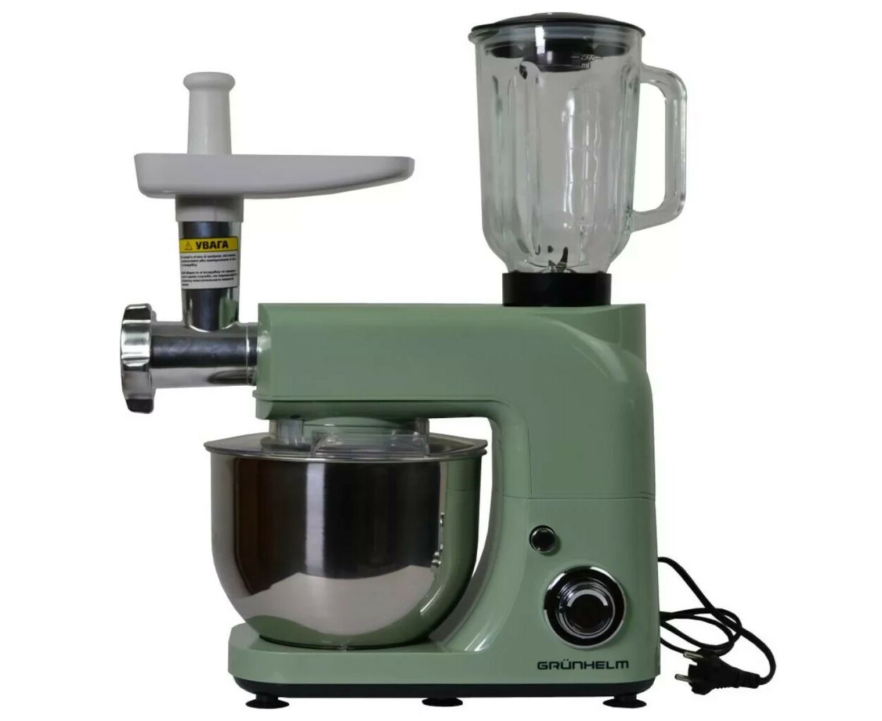 Тип - кухонная машина, мощность - 1800 Вт, объем основной чаши - 5 л, объем чаши блендера - 1.5 л, функции - замешивание теста, блендер, мясорубка, Цвет - зеленый